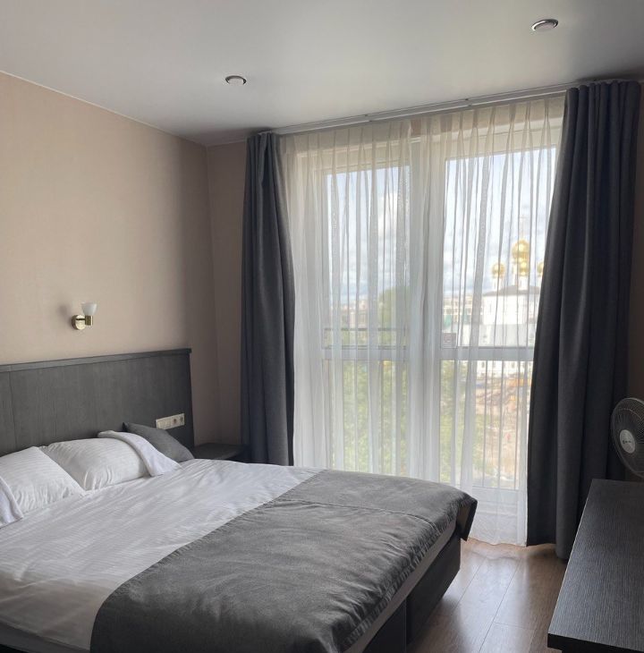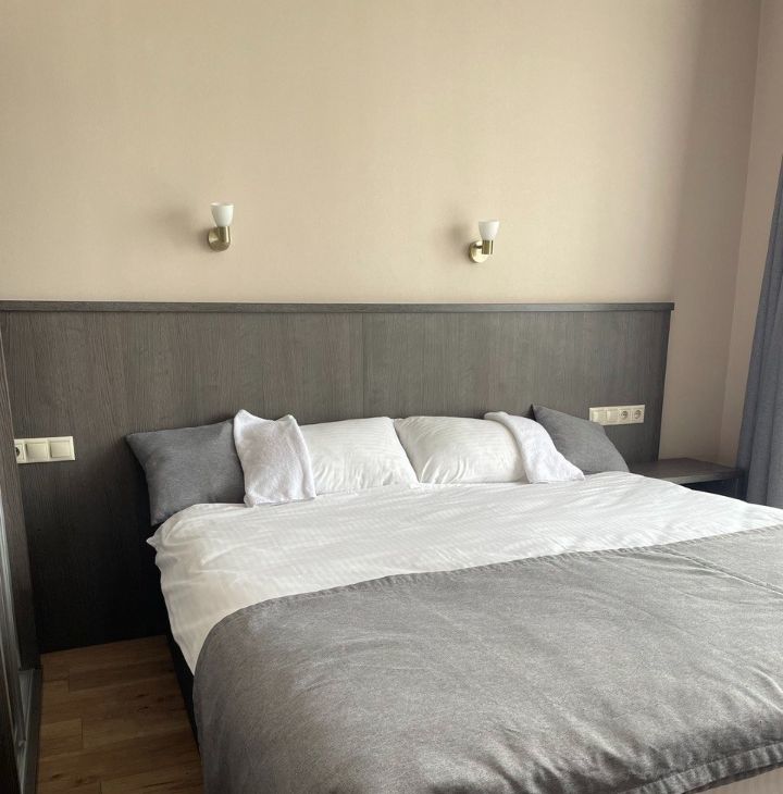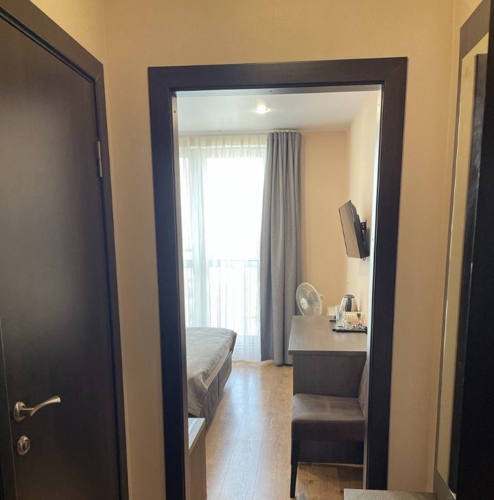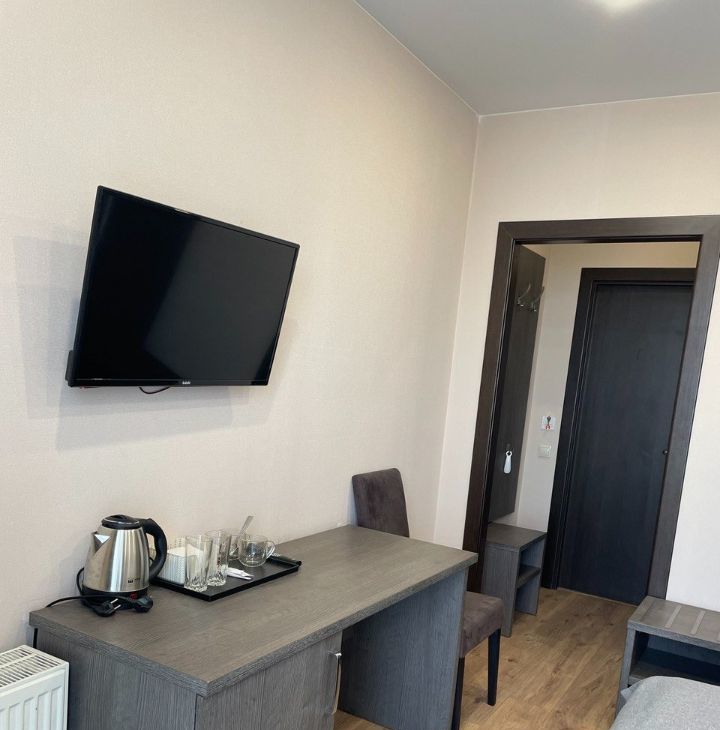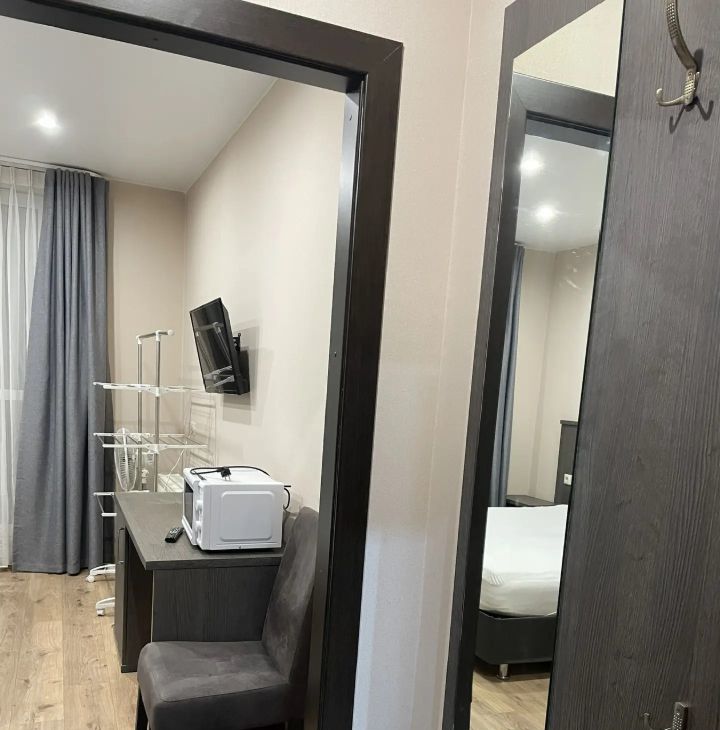 Внутри выполнен косметический ремонт. В квартире есть телевизор и необходимая мебель: кровать и стол. Санузел совмещенный. Общая стиральная машина и микроволновка.