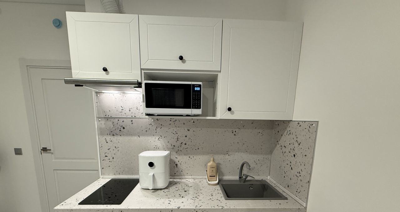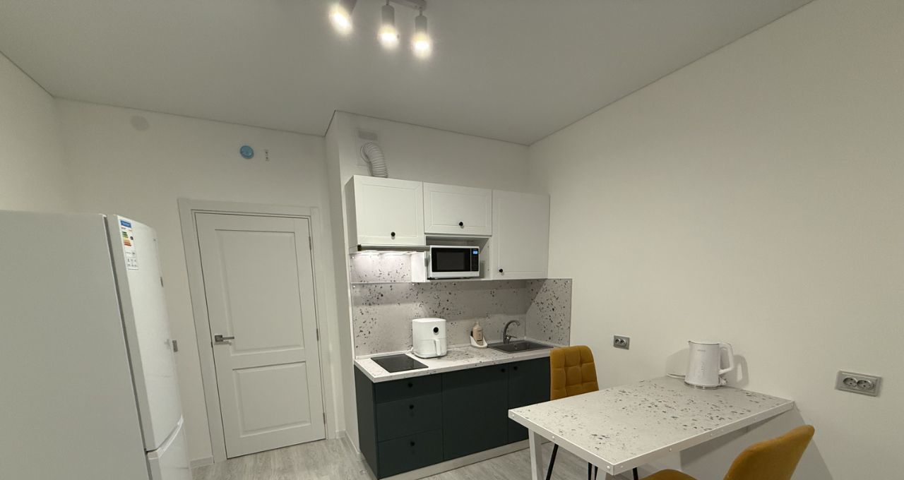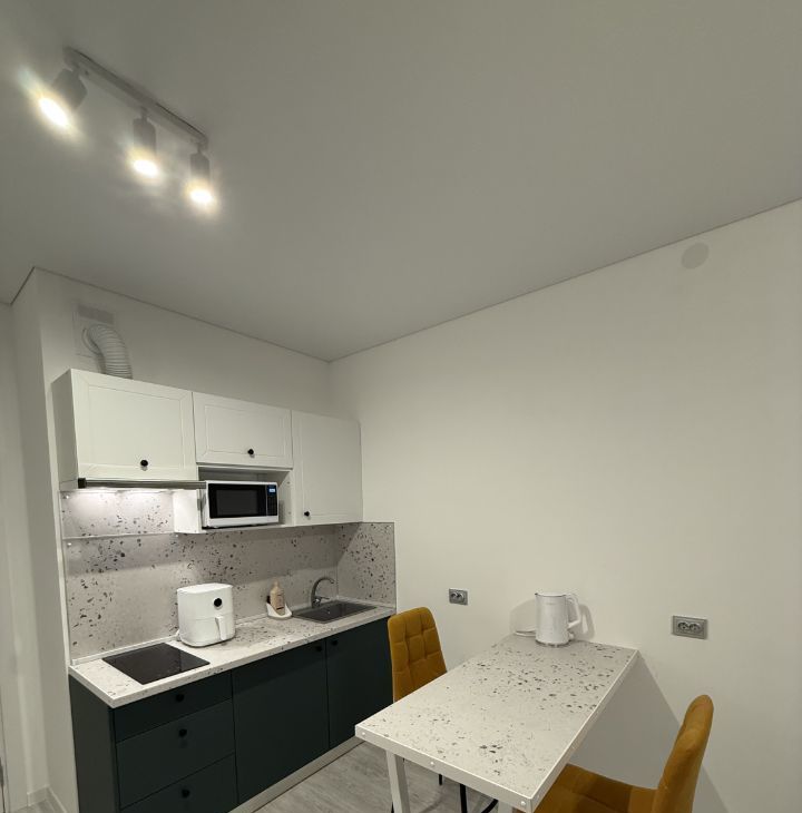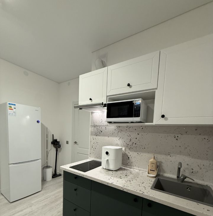 • Кухня: Эстетичный гарнитур, обеденный стол с текстурой терраццо. Из техники: двухкамерный холодильник, варочная панель, микроволновая печь, чайник и современный аэрогриль.