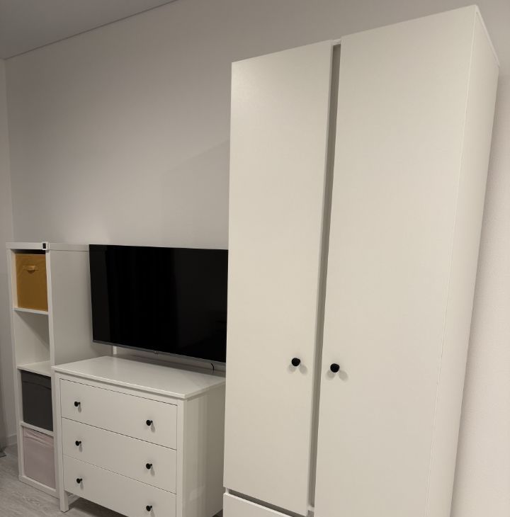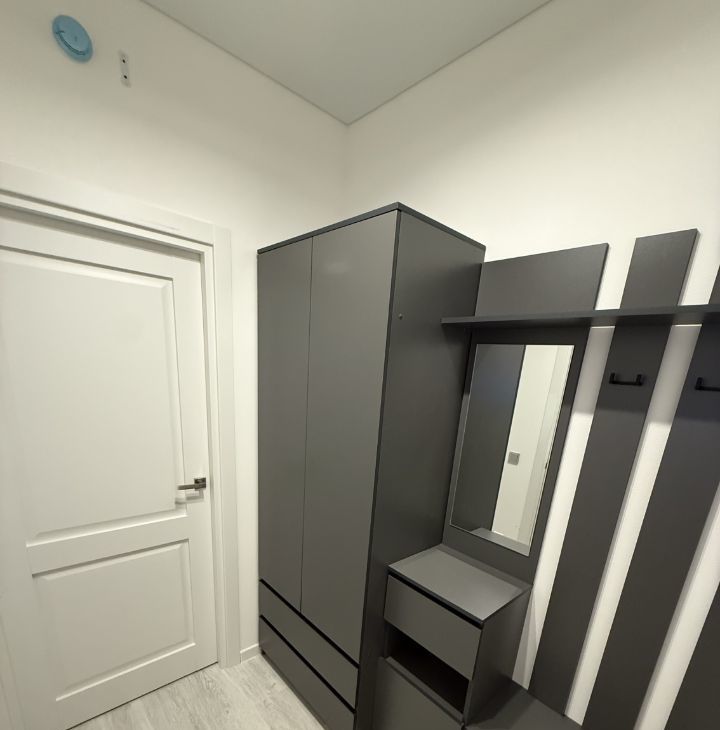 • Хранение: Вместительный шкаф, комод и стеллаж в комнате, а также функциональная прихожая с большим зеркалом.