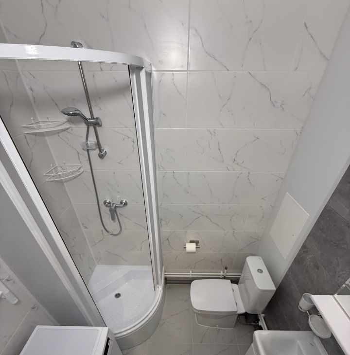 • Санузел: Совмещенный, с просторной душевой кабиной, стиральной машиной и электрическим полотенцесушителем.
