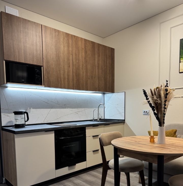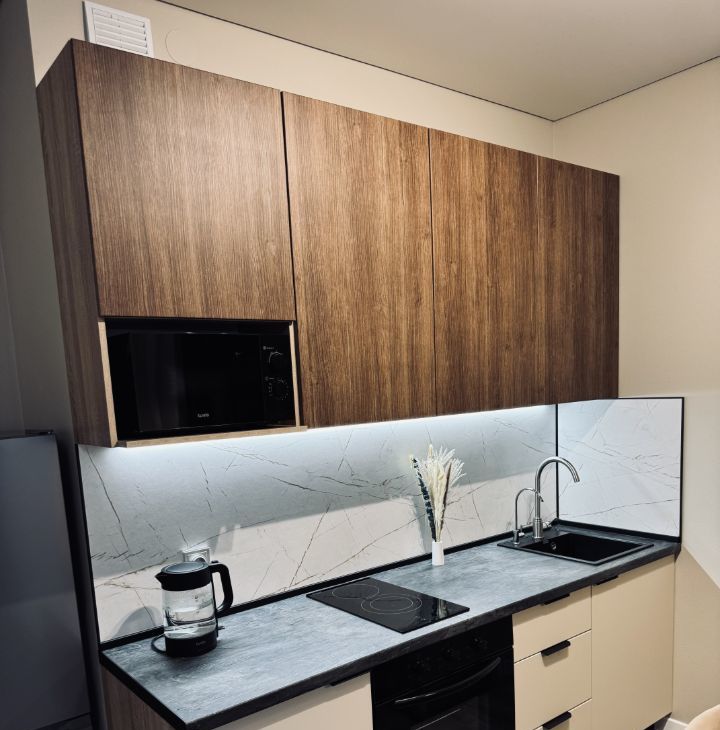 Вся техника и мебель новая, включая: электрический чайник, варочную поверхность, духовой шкаф, двуспальную кровать , ортопедический матрас Askona с двумя степенями жесткости, стиральную машину, холодильник, телевизор, установлен фильтр для питьевой воды