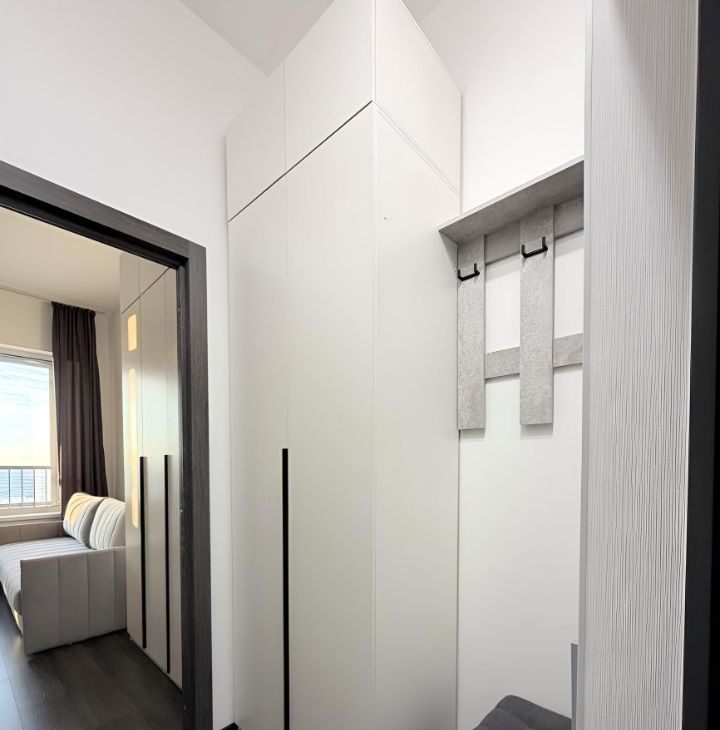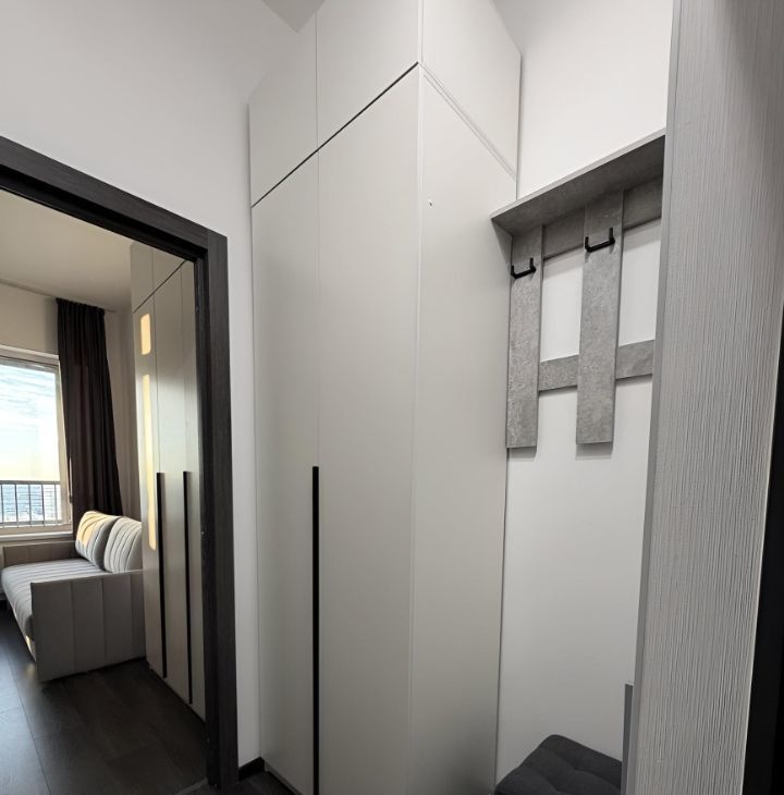 - большой шкаф для верхней одежды, вешалка с крючками и пуф