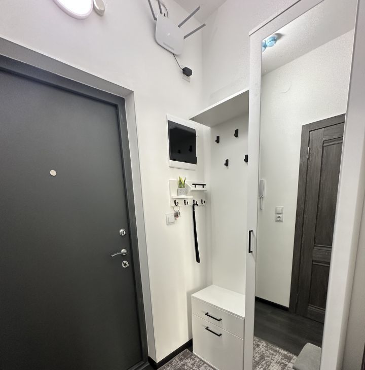 Сдается очень светлая, стильная студия с современным ремонтом, в отличном новом доме. Закрытая территория, выход из парадной на 2 стороны, на каждой стороне есть специальные помещения для колясок, велосипедов и иного спортивного инвентаря (закрывается на ключ). Закрытая парковка на территории ЖК.
