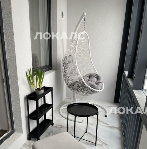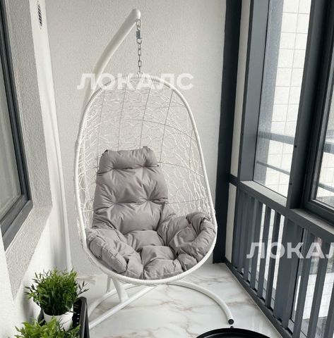 На просторной лоджии обустроено место отдыха с подвесным креслом. Вид из окон на