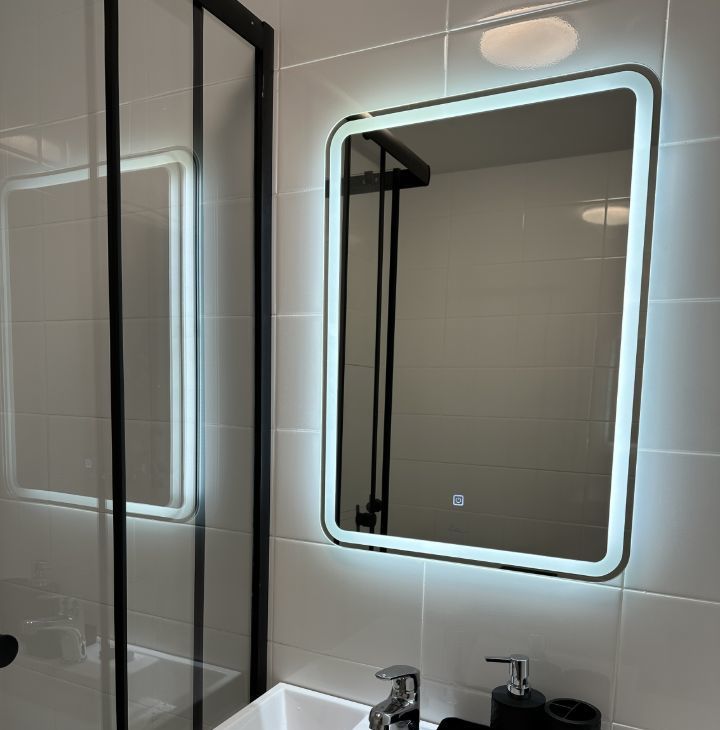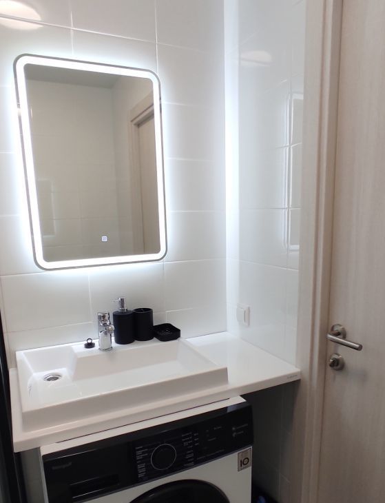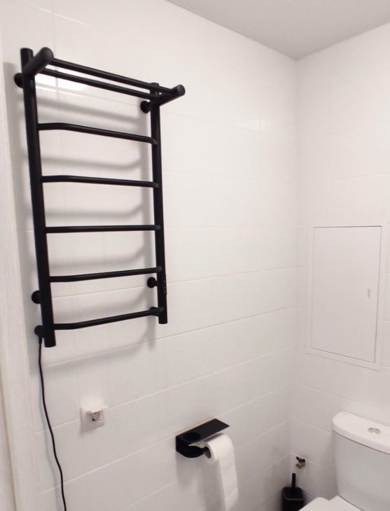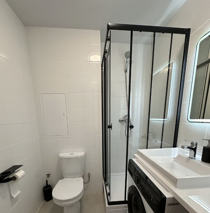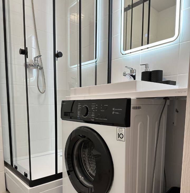 В санузле произведена замена стандартной раковины для компактного размещения стиральной машины и тумбой для хранения принадлежностей. Дополнительно установлен электрический полотенцесушитель и современная душевая кабина.
