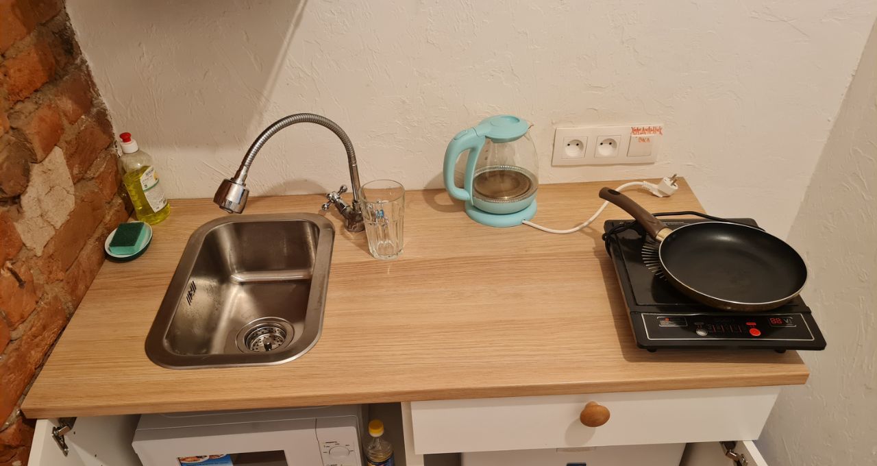 Свежий ремонт . Своя кухня с плитой, свч печь., холодильник , посуда , чайник и тд. Свой сунузел.
