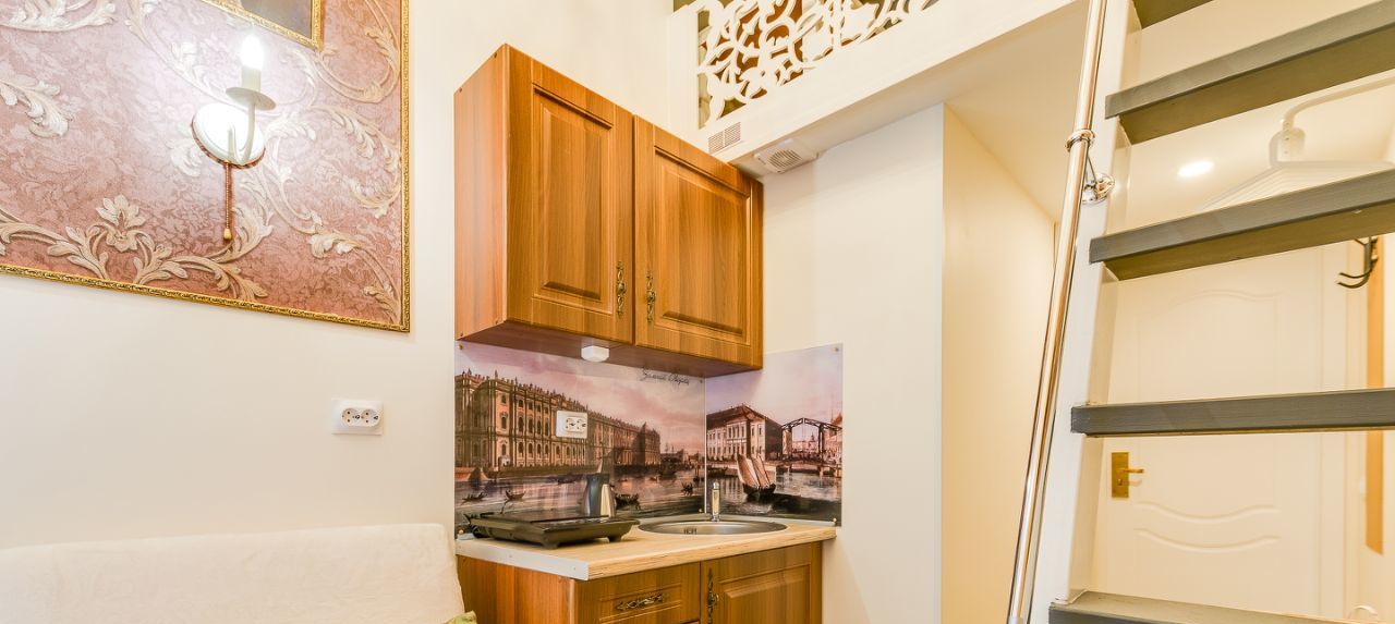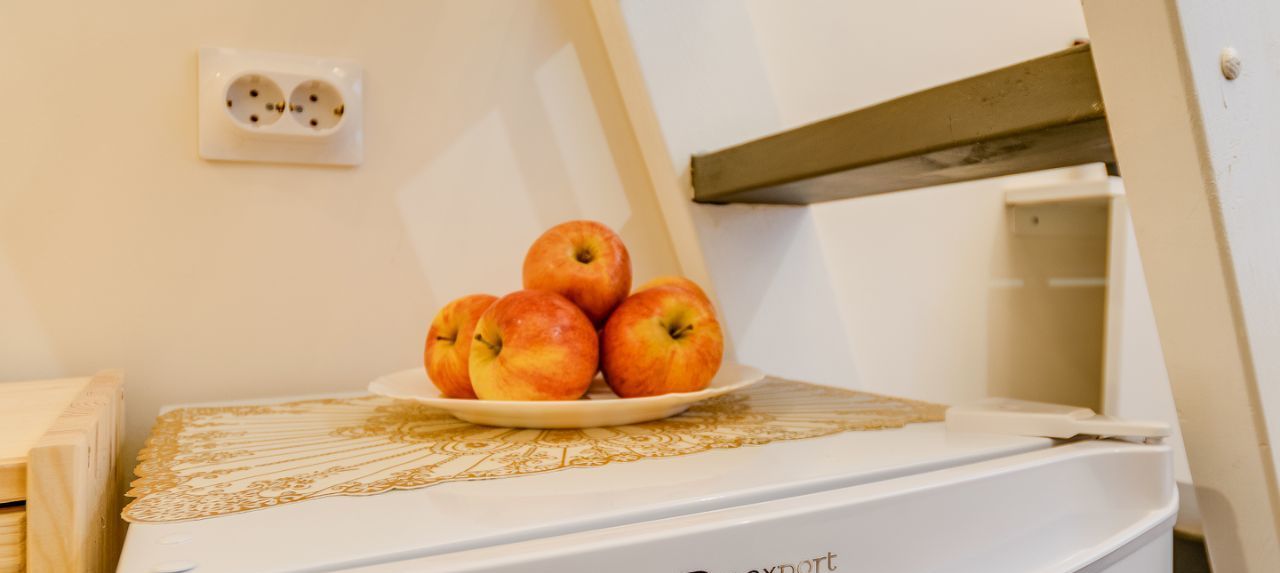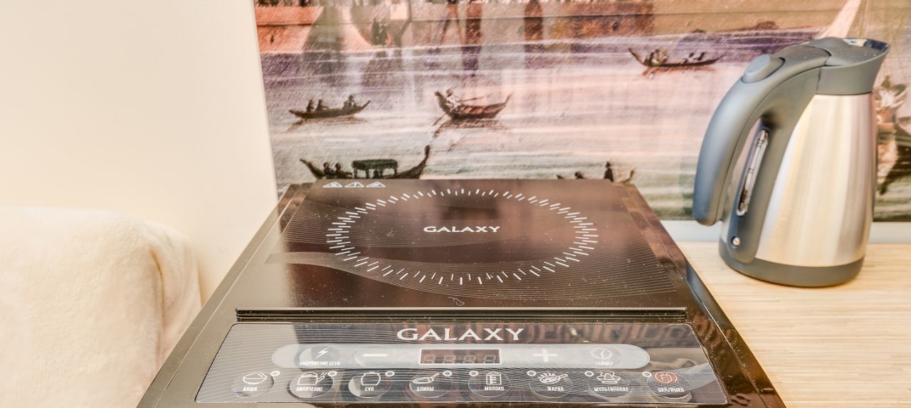 В студии чайник, индукционная плита, холодильник. На общей территории расположена гладильная доска, стиральная машина, микроволновая печь, кулер - доступные для пользования