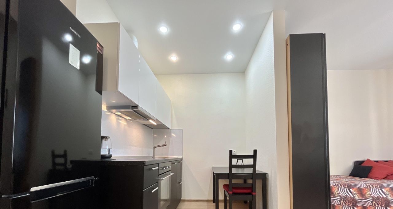 В студии есть всё необходимое: мебель, стиральная и посудомоечная машина, холодильник, микроволновая печь, духовой шкаф, интернет.