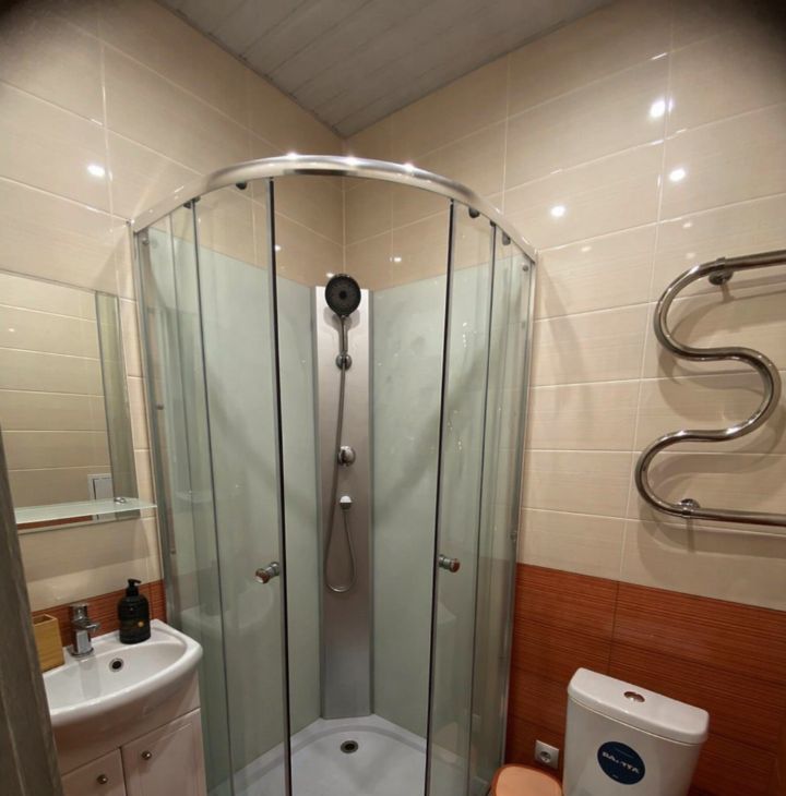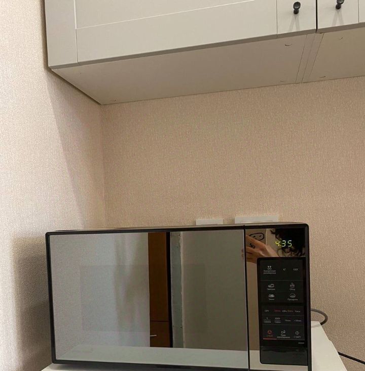 Кухня оборудована всей необходимой техникой, включая холодильник, посудомоечную машину, плиту, духовку, микроволновку, угольную вытяжку, стиральную машину. В комнате есть полка, диван, стол, 2 стула, кровать, камод и телевизор. В коридоре шкаф, полка для обуви. Из окон открывается вид на тихий двор с закрытой территорией и детской площадкой. Совмещенный санузел оснащен современной душевой кабиной. В квартире имеется балкон с остеклением.