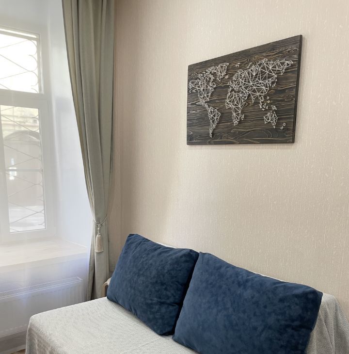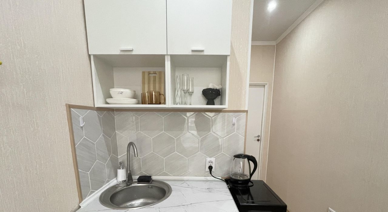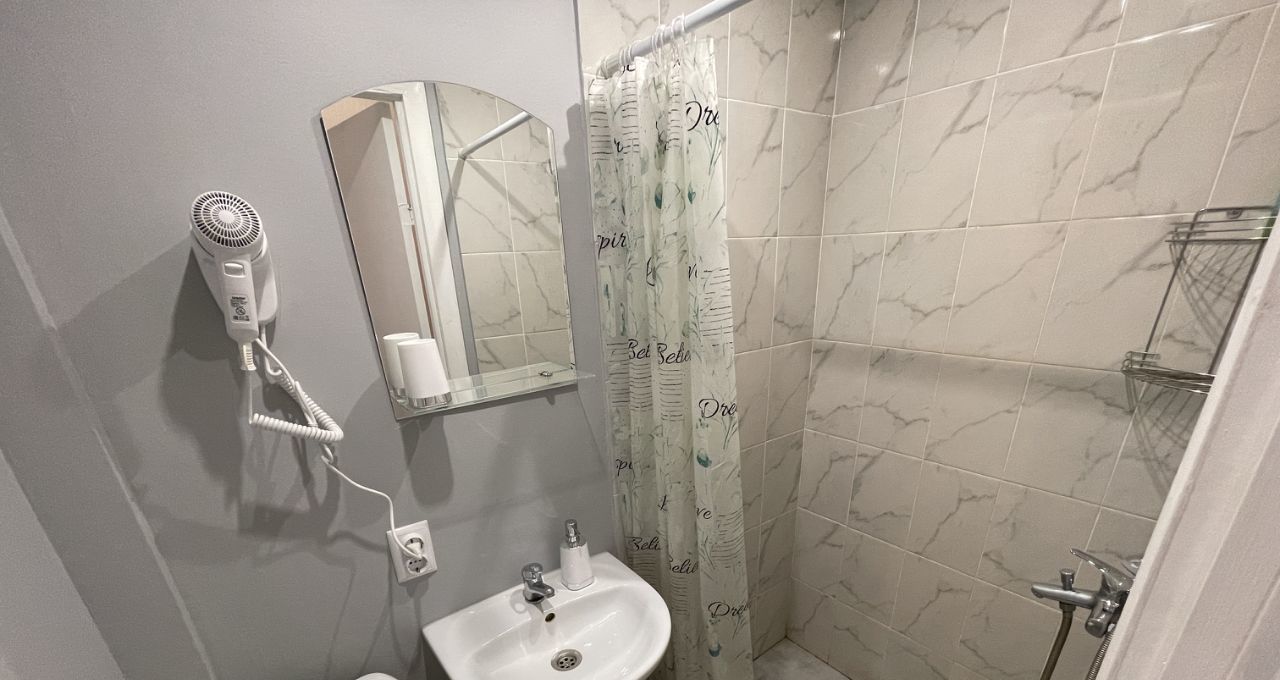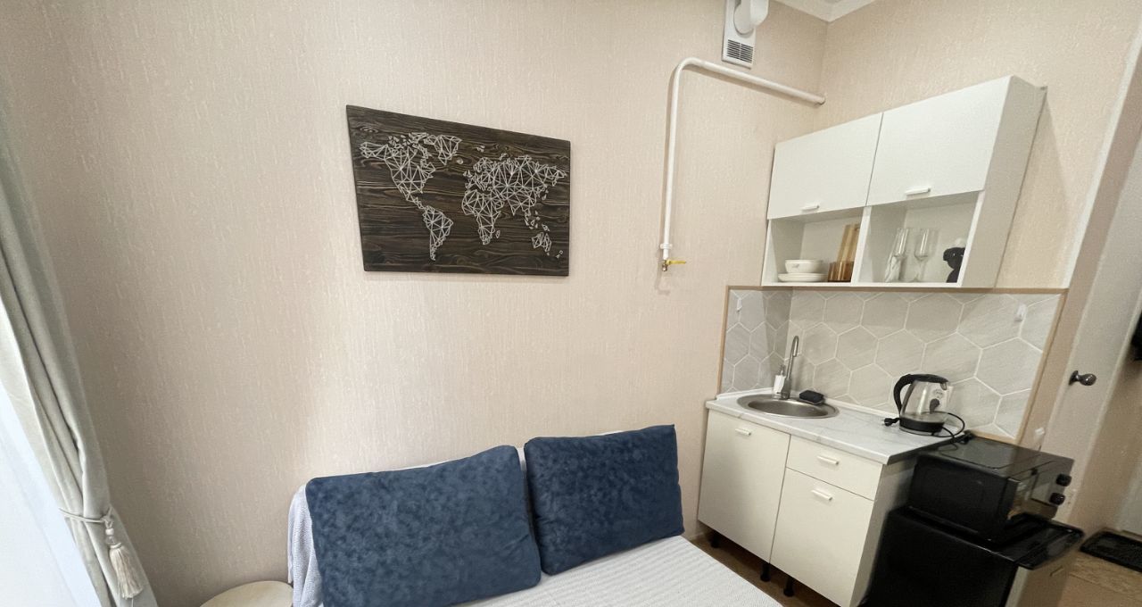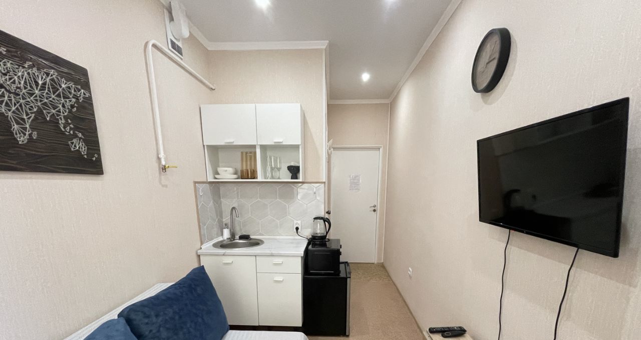 В студии выполнен космический ремонт, есть свой сан узел и кухонная зона со всем необходимым для комфортного проживания (эл.плитка, свч-печь, холодильник, чайник, посуда). Диван двуспальный, разбирается в полноценное спальное место.
