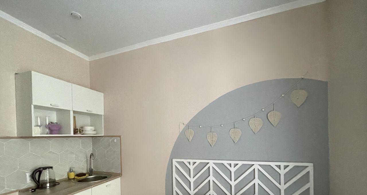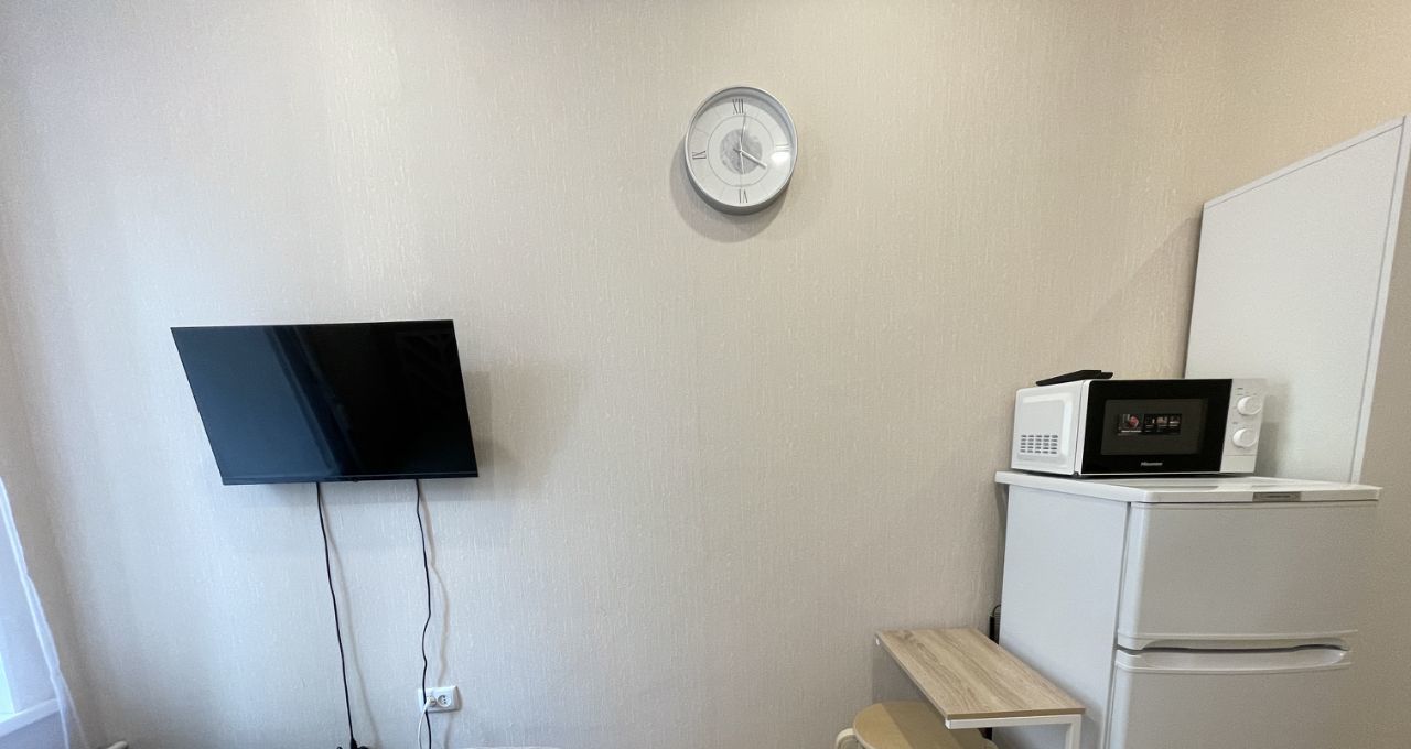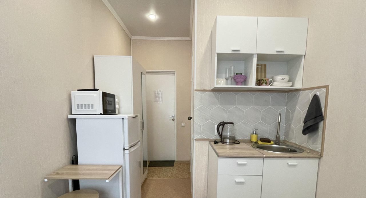 В студии выполнен космический ремонт, есть свой сан узел и кухонная зона со всем необходимым для комфортного проживания (эл.плитка, свч-печь, холодильник, чайник, посуда).