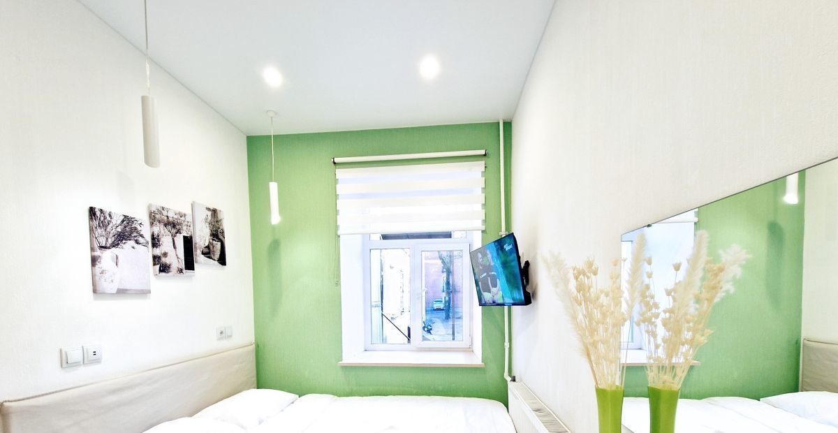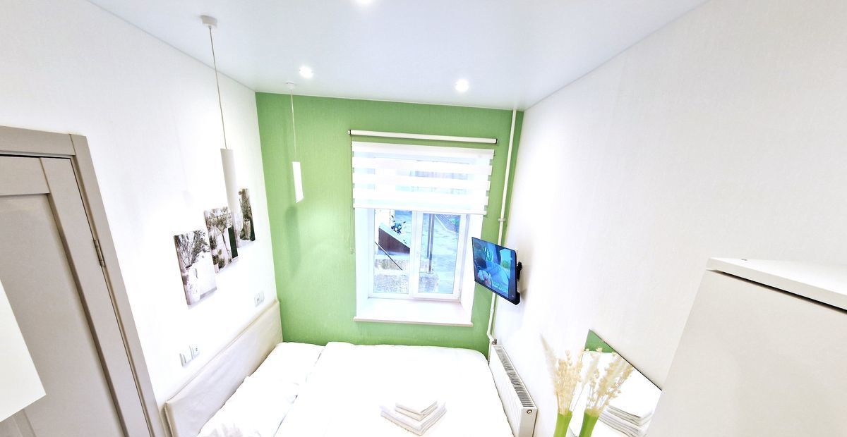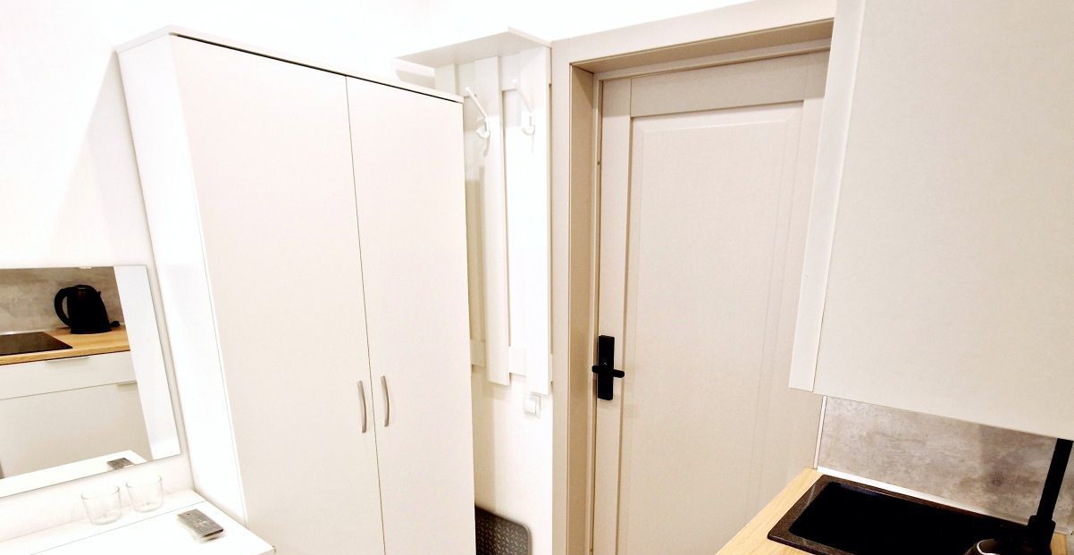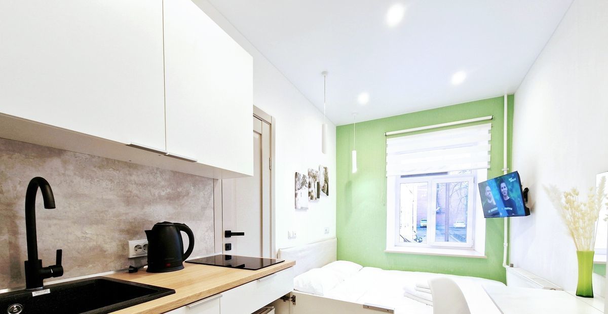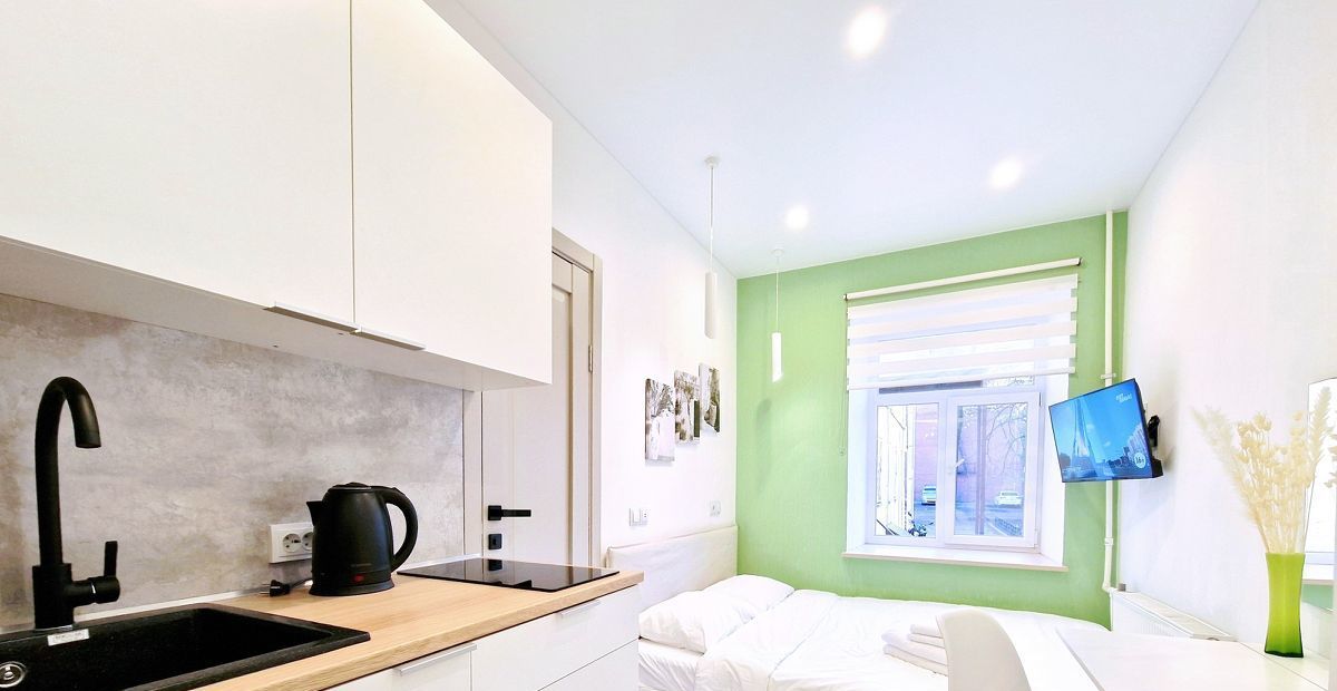 - Для комфортного проживания в студии имеется мини кухня с холодильником, чайником, СВЧ печью и электрической варочной панелью, в комнате установлена вся необходимая мебель с очень удобной двухспальной кроватью шириной 160 см. с качественным ортопедическим жестким матрасом и чистым постельным бельем, есть ЖК телевизор с цифровыми каналами.
