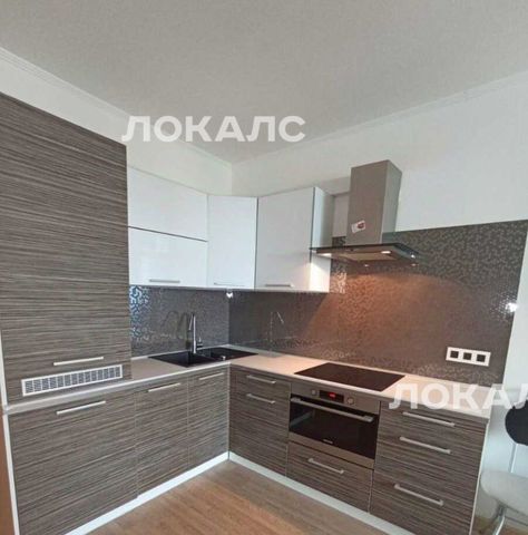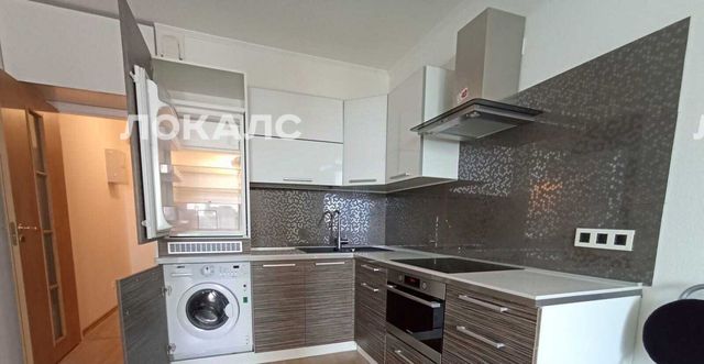 Встроенная кухня, варочная панель, духовой шкаф, вытяжка, холодильник, стиральная машина.