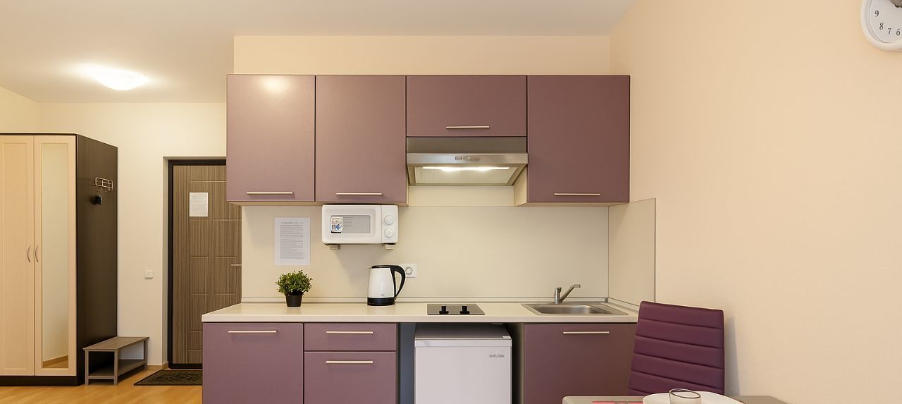 Полноценная кухонная зона: плита, духовка/микроволновка, холодильник, вся посуда и техника.
