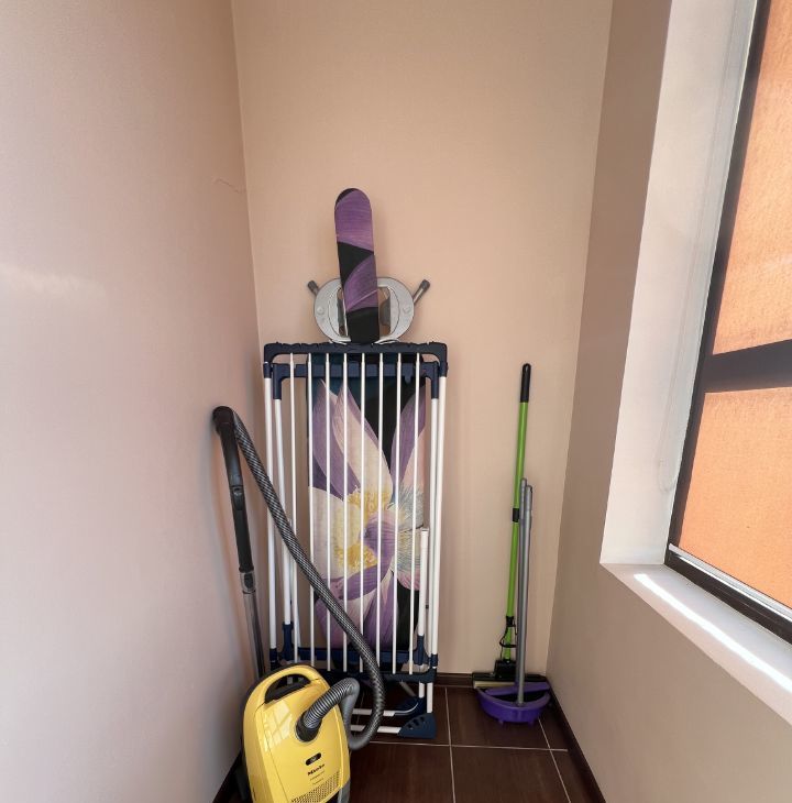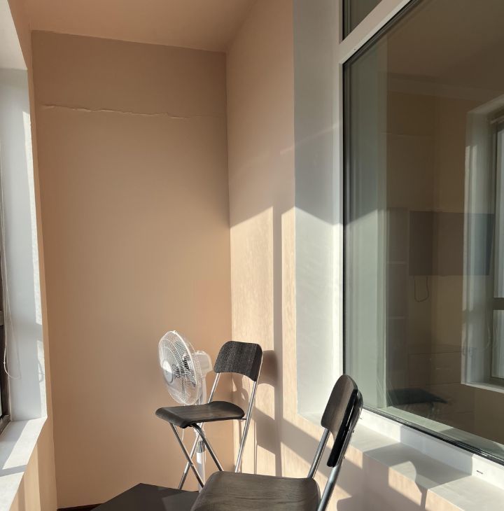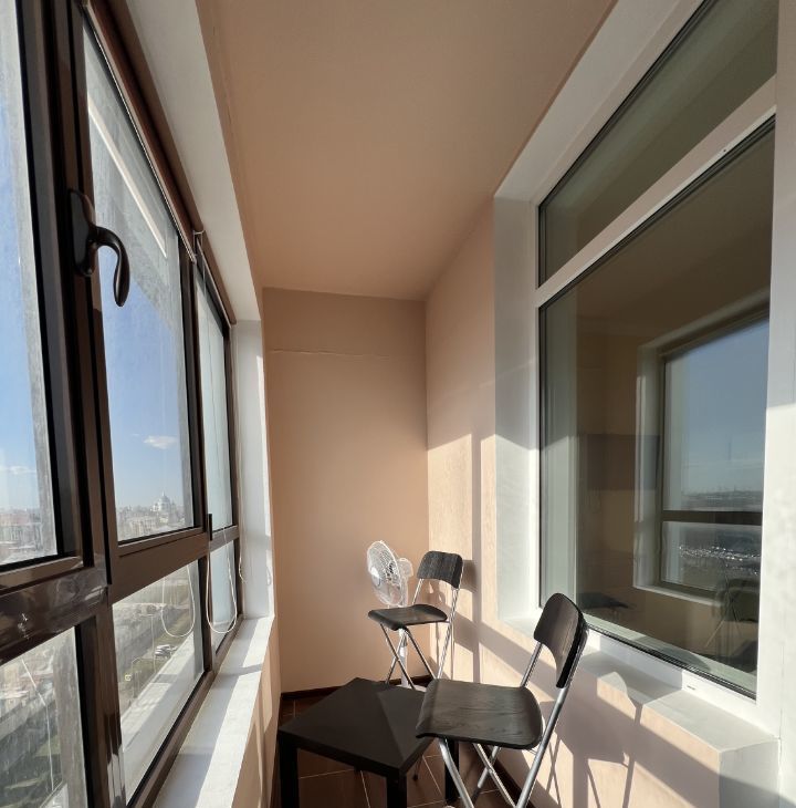 - мебель: встроенная кухня, барный стол и стулья, раскладной диван с полноценным спальным местом, рабочее место с со удобным креслом, встроенный шкаф для одежды, открытый шкаф для книг, сушилка для белья, гладильная доска, мебель для отдыха на лоджии;