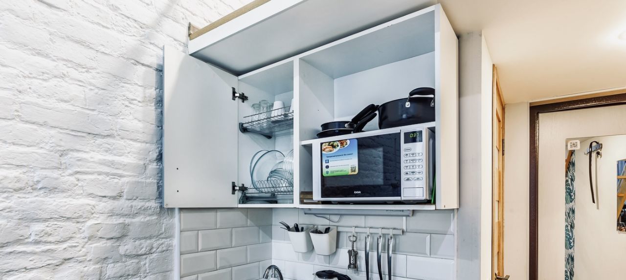 -полностью оборудованная кухонная зона (плита, холодильник, чайник, столовые приборы, посуда)