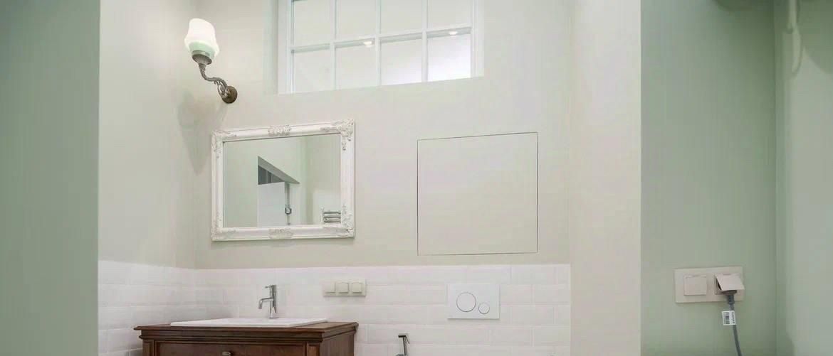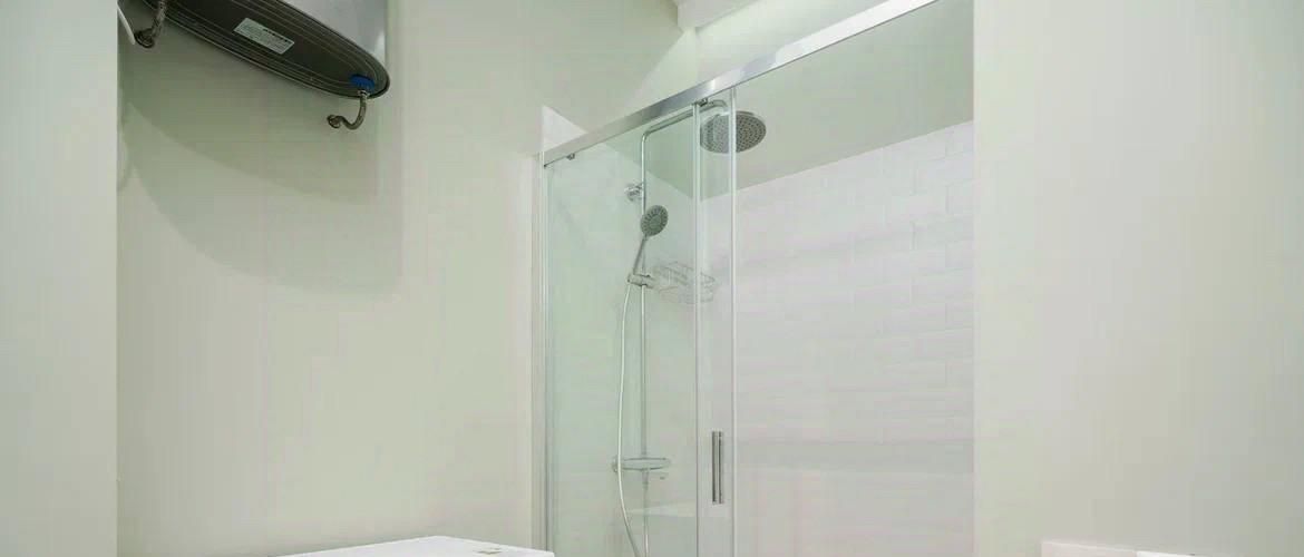 - в санузле установлена инсталляция и современная душевая кабина, отделанная кафелем, вместительный бойлер на случай отключения горячей воды, световое окно наполняет естественным светом,