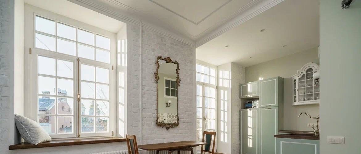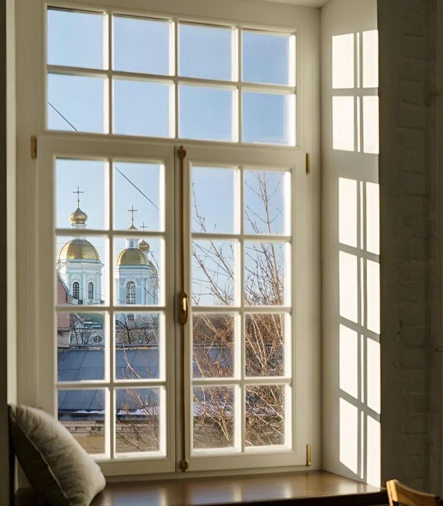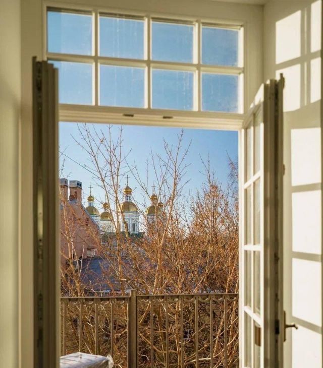 - деревянное окно в пол с латунными ручками выходит на балкон, с которого открывается вид на панораму петербургского внутреннего двора и Никольский собор,