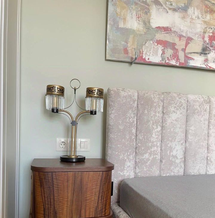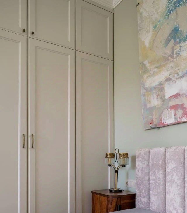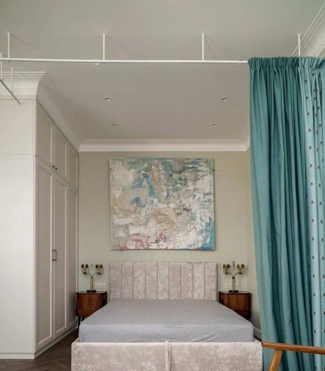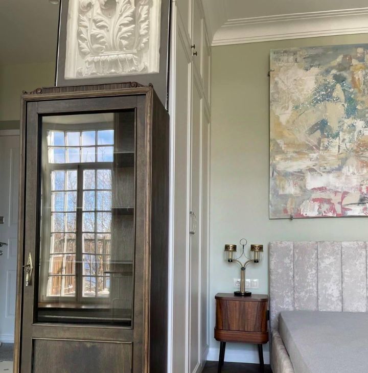 - уединенную спальную зону с ортопедическим матрасом повышенной жесткости и системой хранения, вместительным шкафом с рейлингами и полками, тумбами и раритетным светильниками,