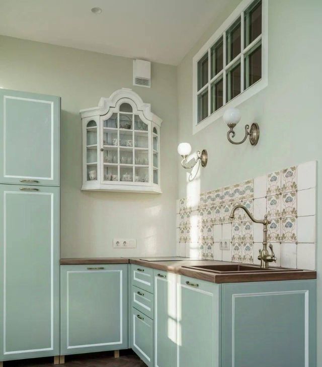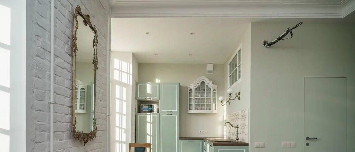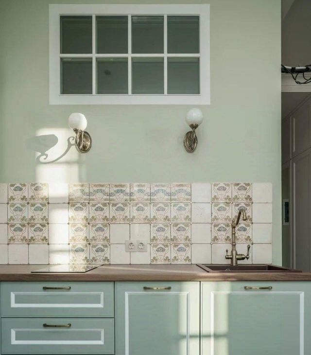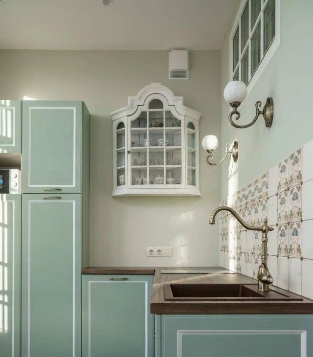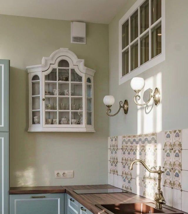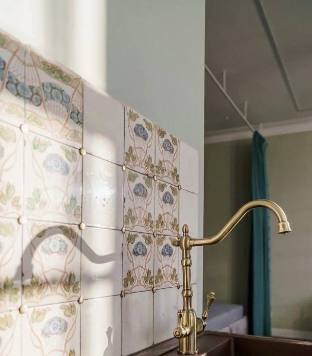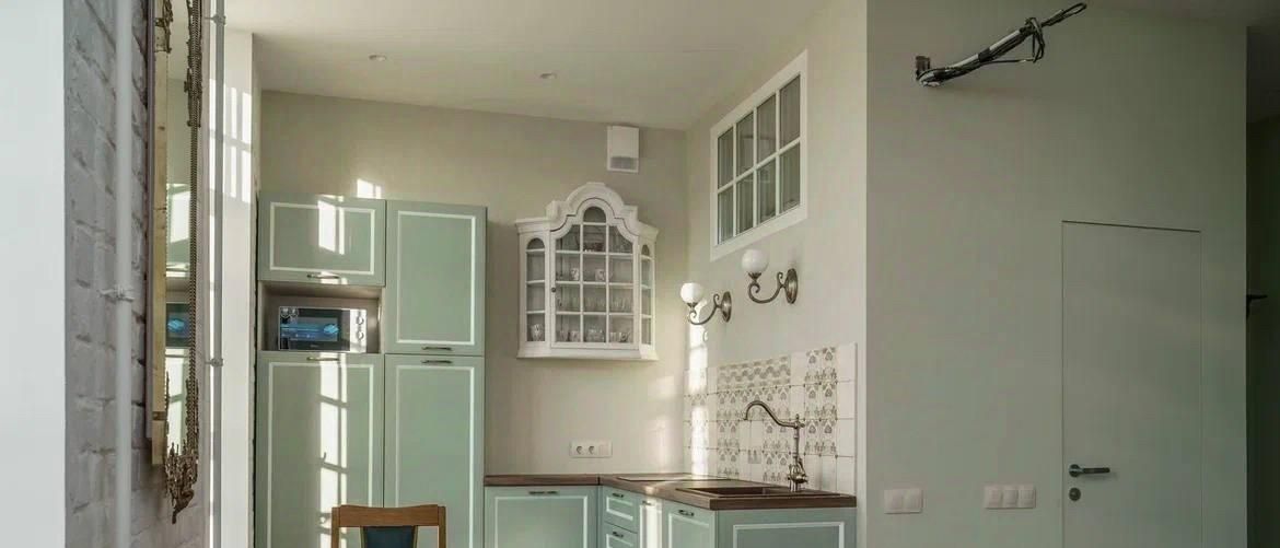 - зону кухни с фартуком из бережно сохраненной старинной кафельной плитки, латунными краном и бра, местами для хранения кухонной утвари и других вещей,