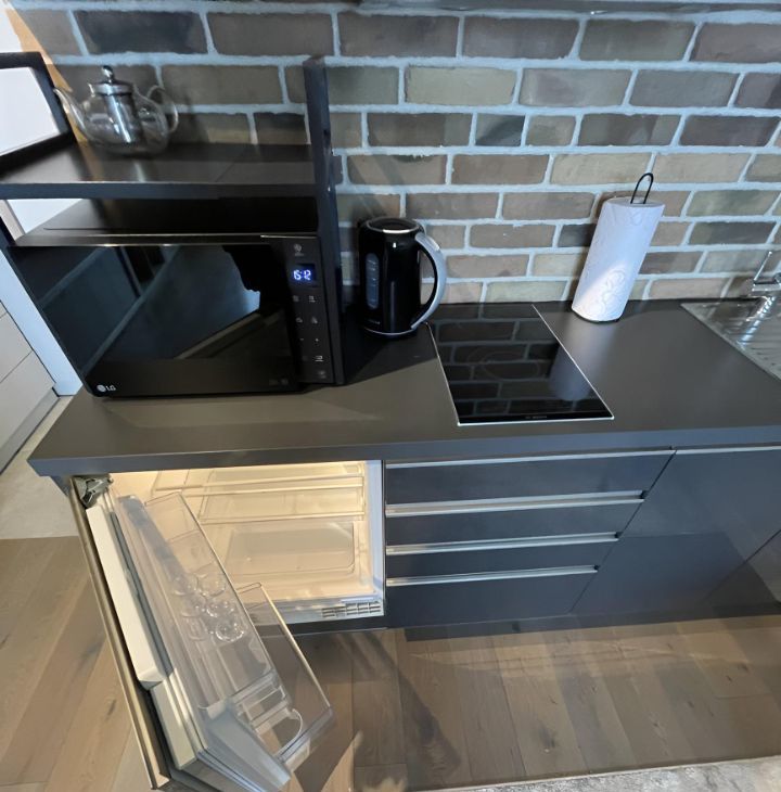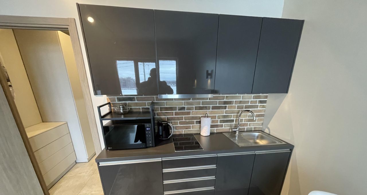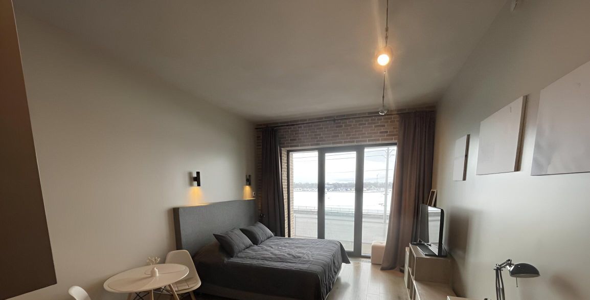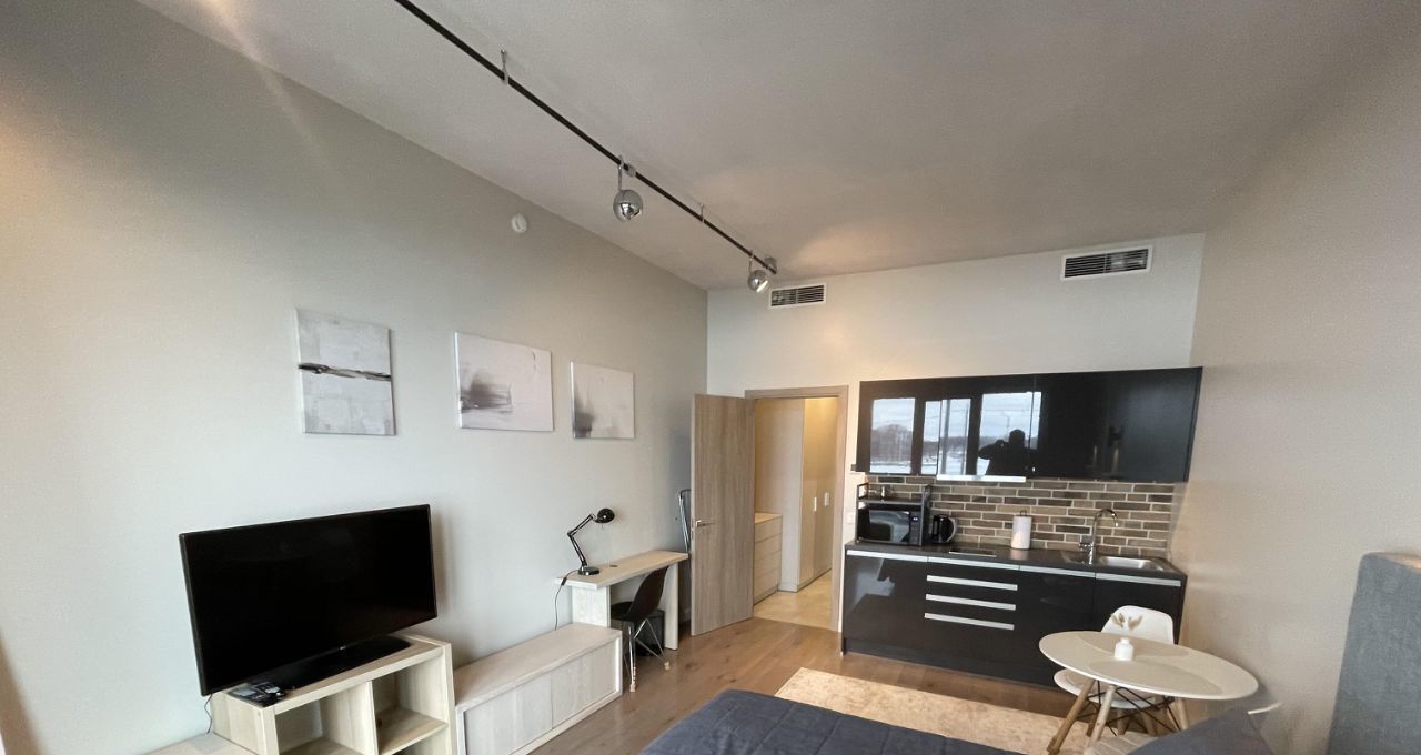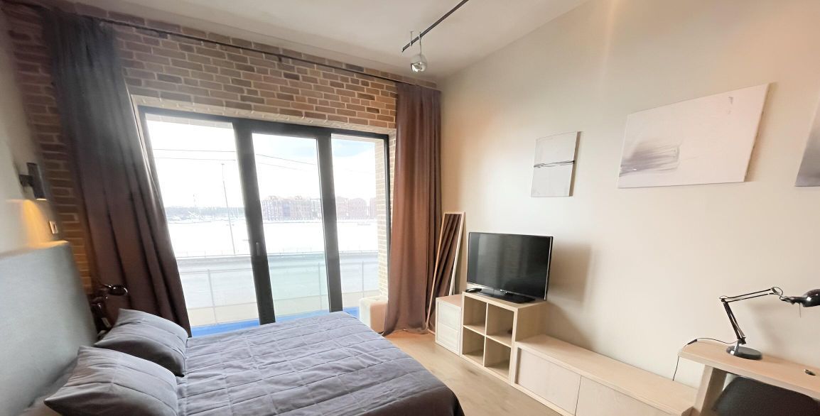 Сдается стильная студия от собственника с дизайнерским ремонтом в монолитно-кирпичном доме 2018 года постройки. Просторная комната оборудована всем необходимым: есть удобная кровать, шкафы для хранения вещей и рабочий стол с лампой. В кухне установлена современная бытовая техника, включая холодильник и микроволновую печь. Из окон открывается живописный вид на реку и городские пейзажи.
