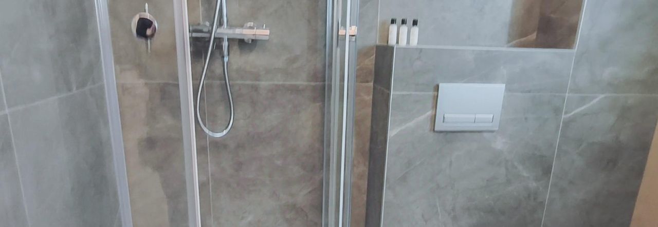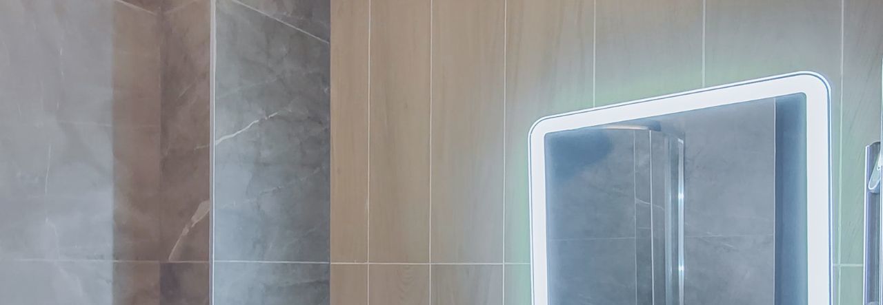 Ванная комната в кафеле, здесь нашлось место душевой кабине, умывальнику с зеркалом с подсветкой.
