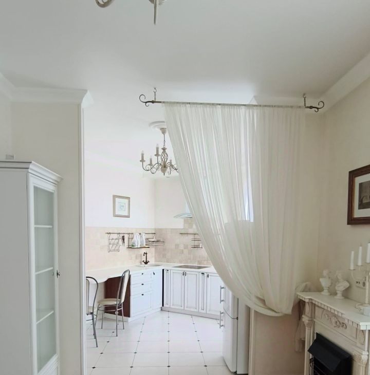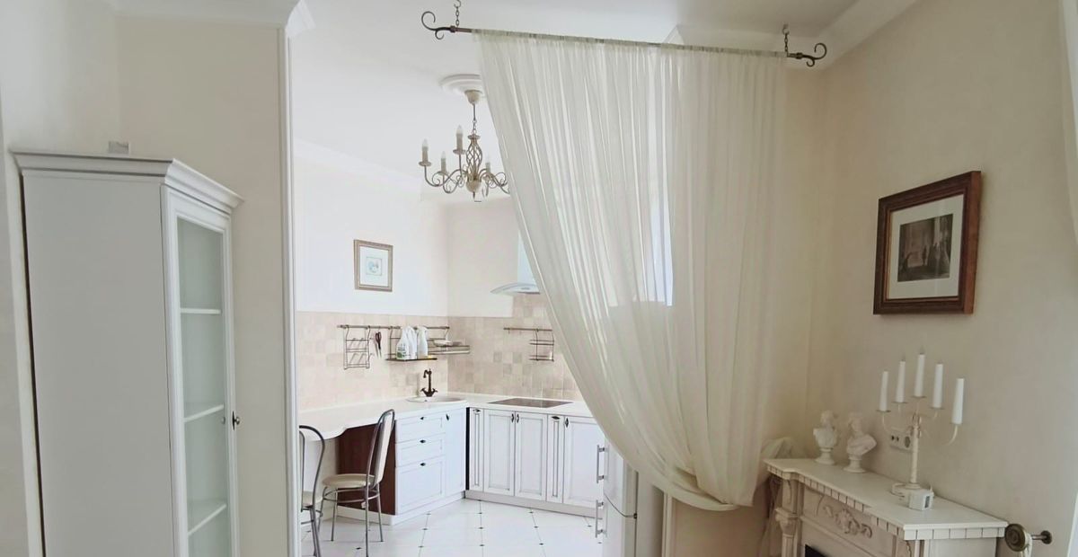 Кухня объединена с жилой комнатой большой аркой.