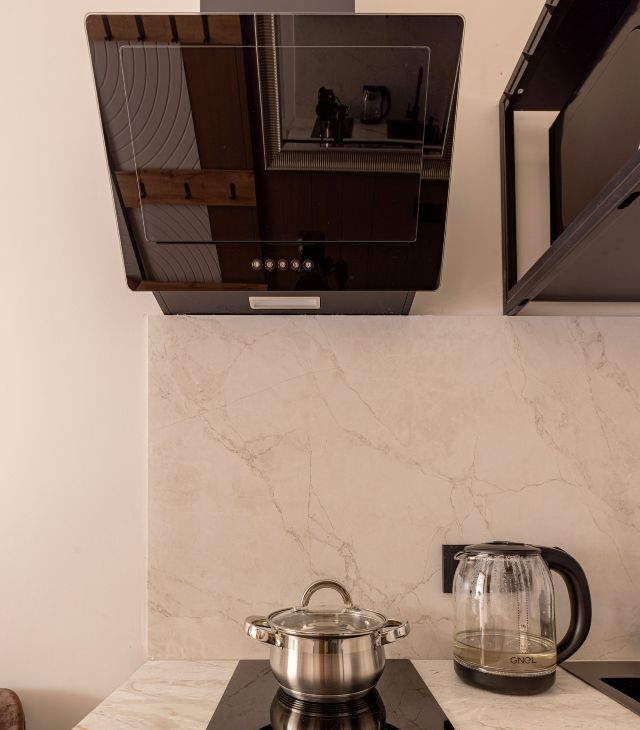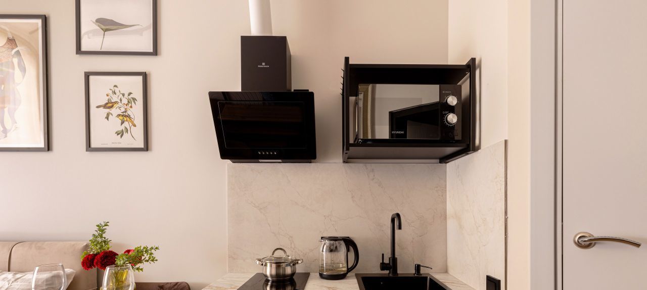 - Coбcтвeннaя кухня (pакoвинa, плита, xoлодильник, электрический чайник, микроволновая печь, посуда)