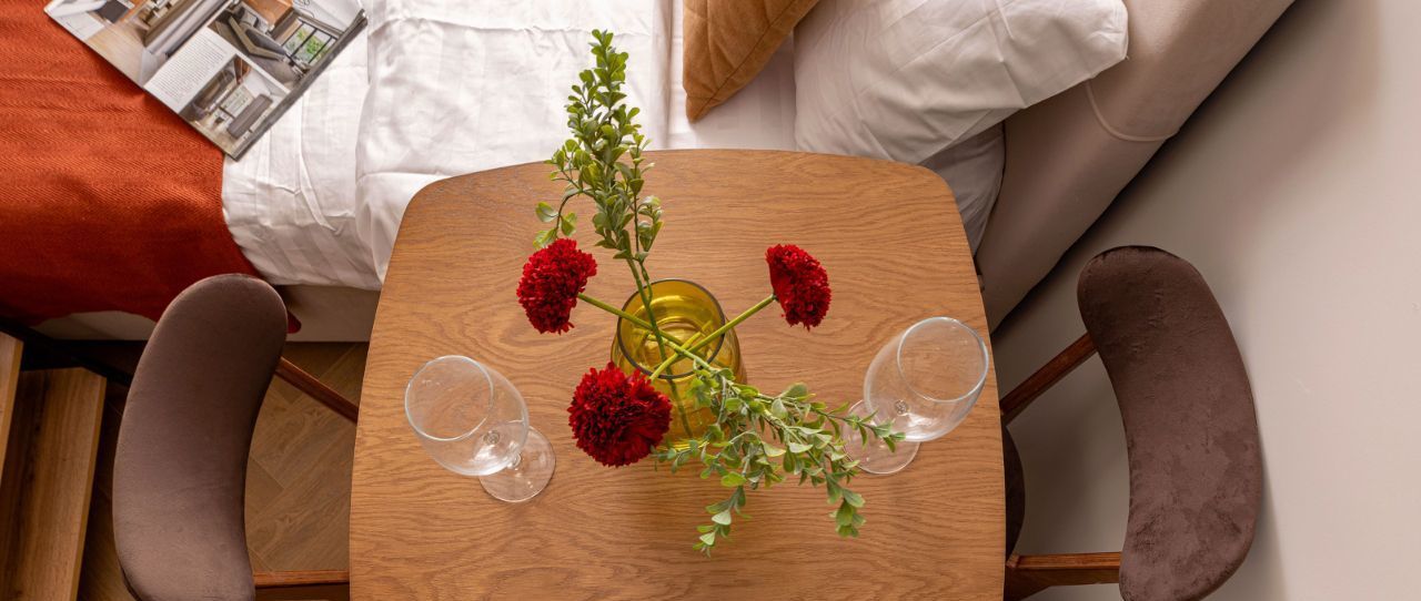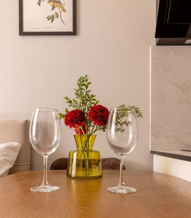 - Удобная двуспальная кровать с качественным матрасом, обеденный стол