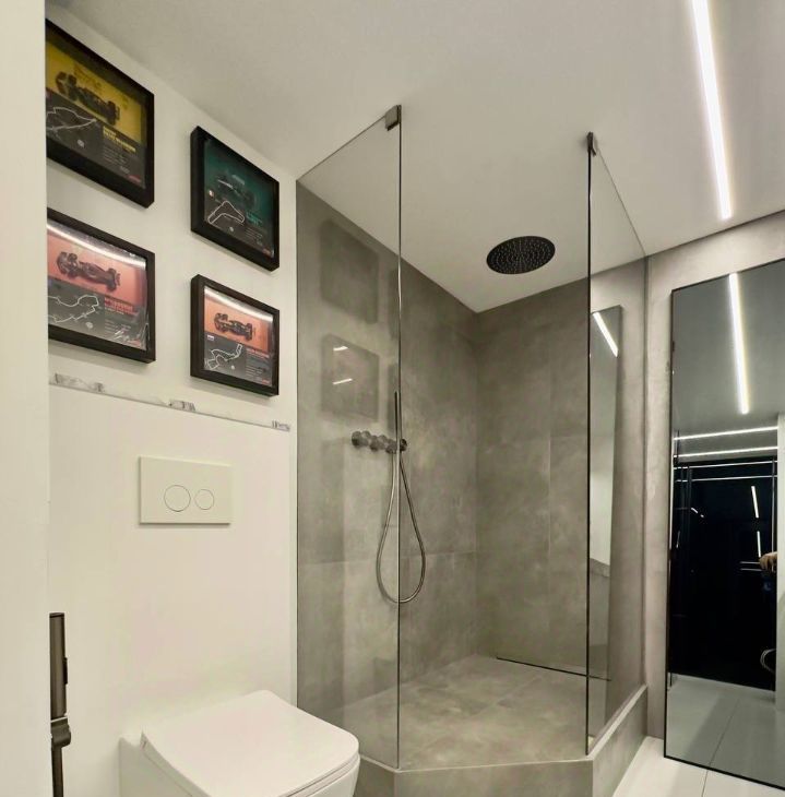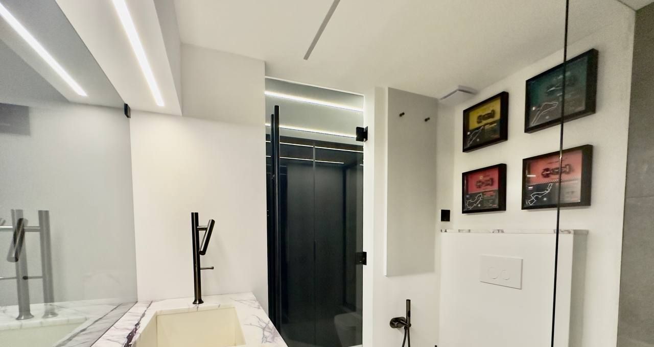 Просторный санузел, установлена современная бытовая техника. Кухонная зона оснащена мраморной столешницей, что добавляет ей элегантности.