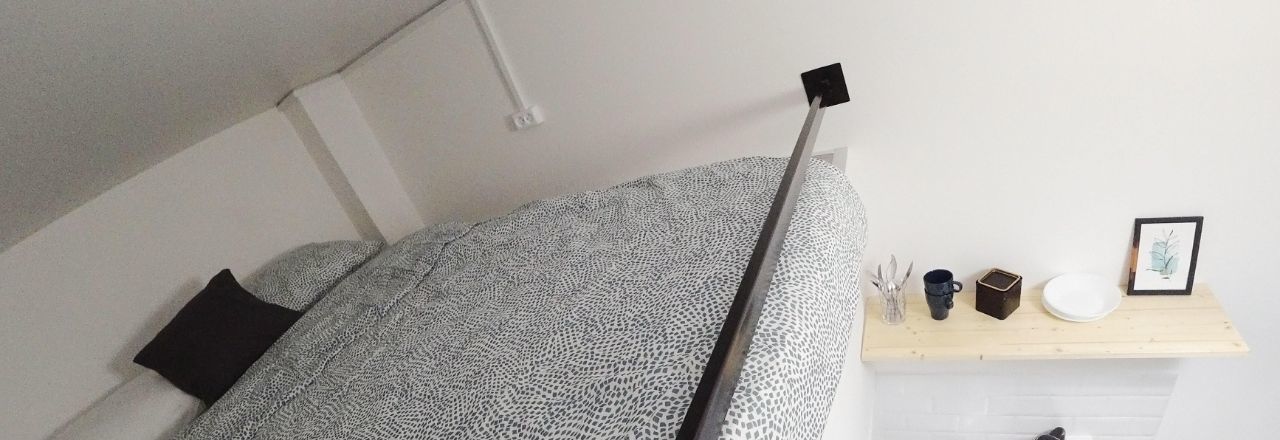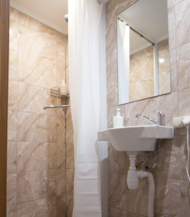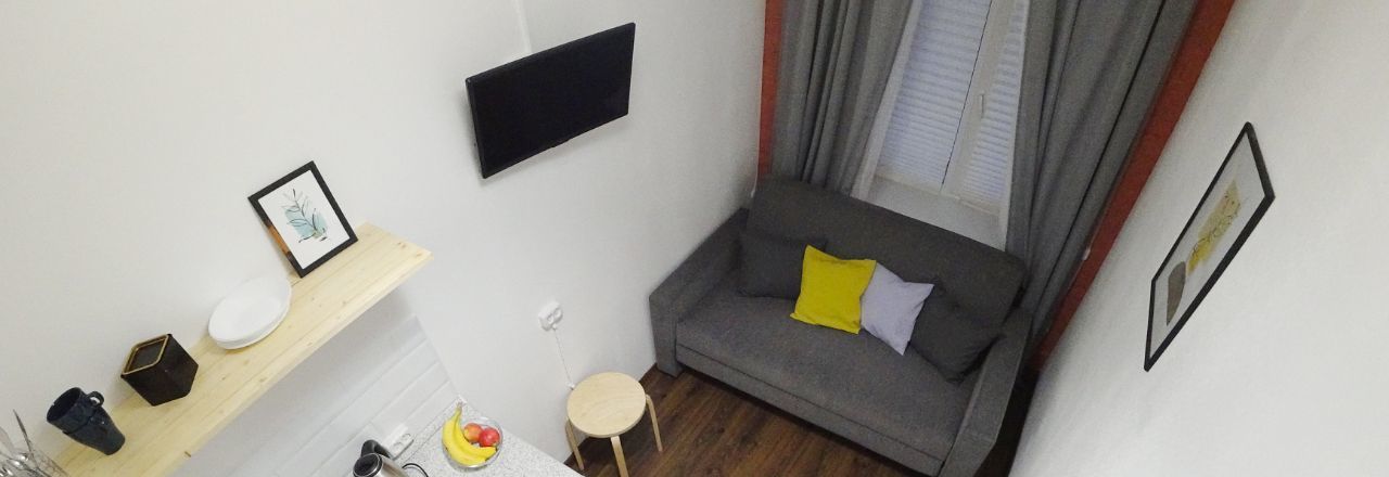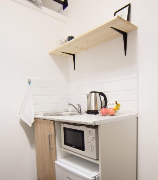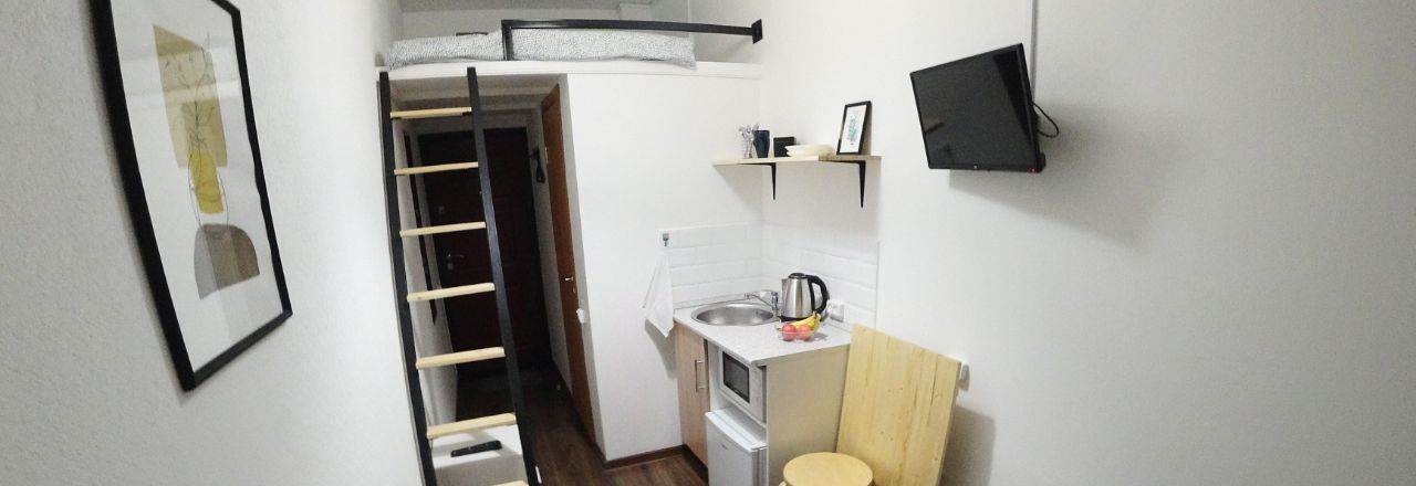 В студии есть всё для проживания: зона отдыха, душ, туалет, кухня (микроволновка, чайник, холодильник, индукционная плита, стол, стулья), второй ярус. Сделан свежий ремонт.
