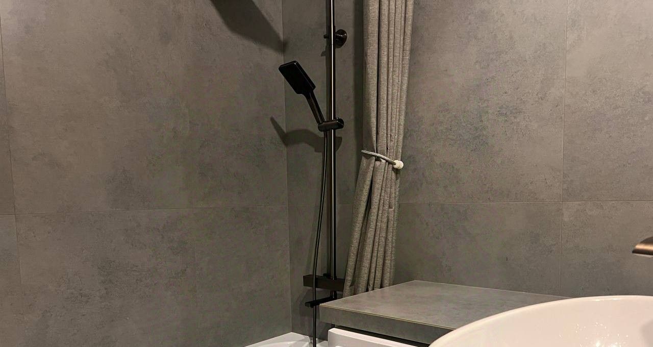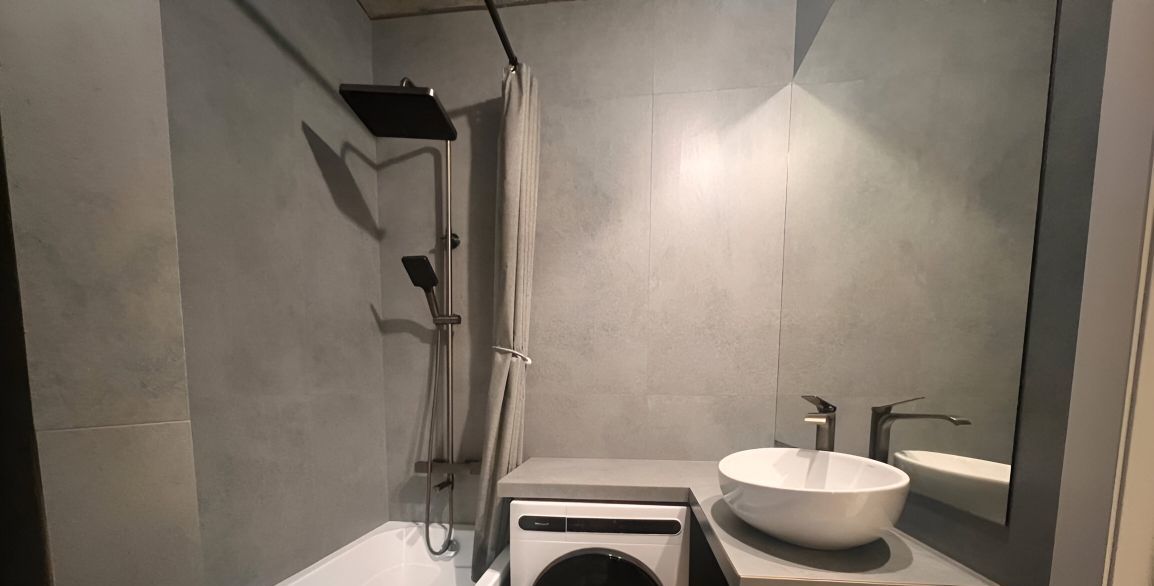 Ванная комната совмещена, оснащена ванной, тропическим душем, стиральной машинкой с сушкой, рядом с инсталляцией расположен гигиенический душ, около зеркала расположен потолочный светильник с теплым светом, что создает атмосферу и комфорт.