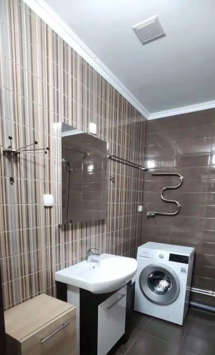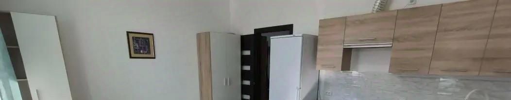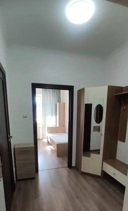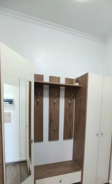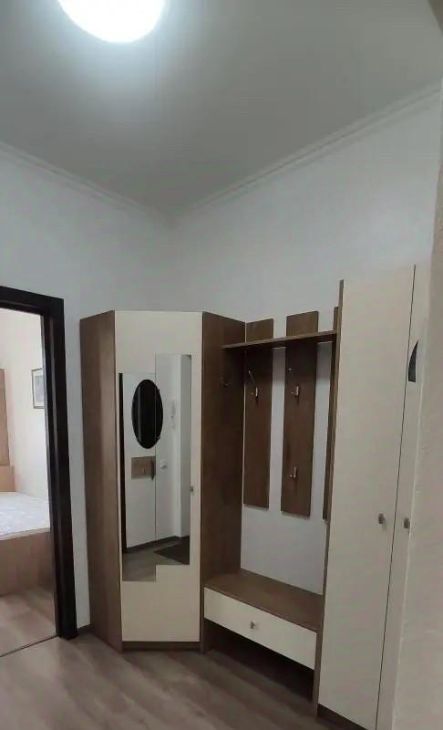 Квартира оборудована новой мебелью и техникой : кровать односпальная , прихожая , два шкафа , холодильник, стиральная машина , вытяжка , кухонный стол , стулья , зеркала .