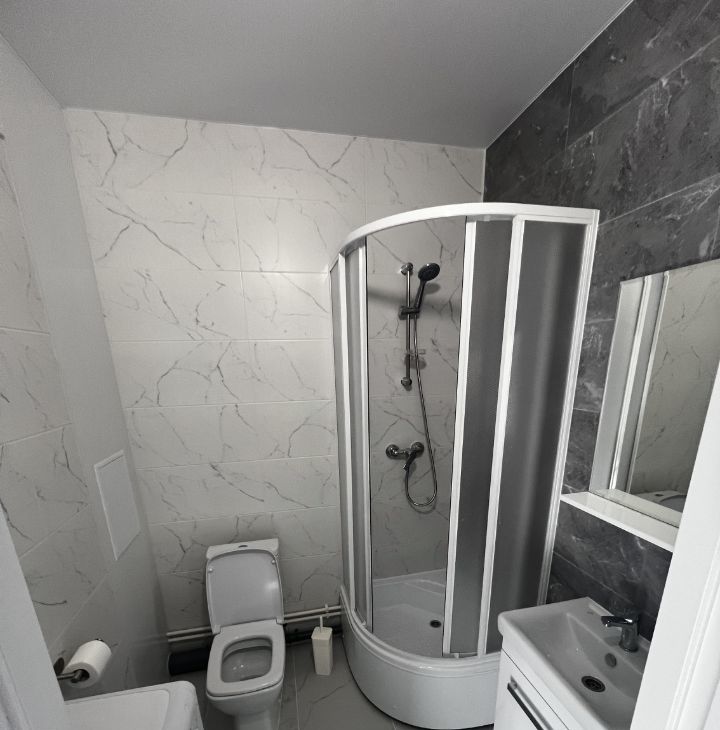 - Просторный совмещенный санузел, в котором располагается душевая кабина, туалет, стеллаж для хранения, стиральная машина.