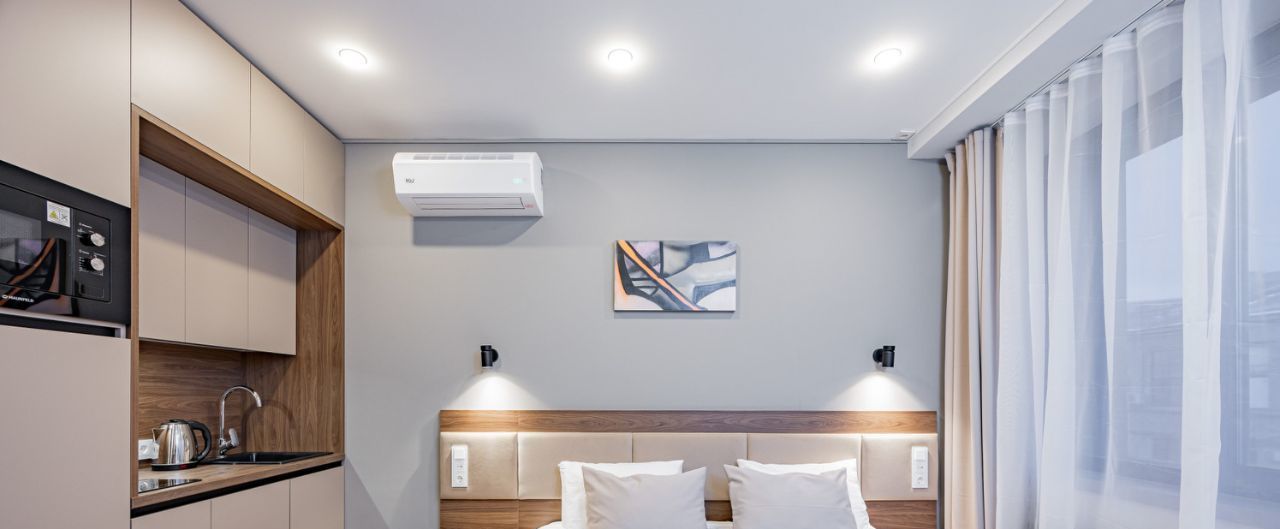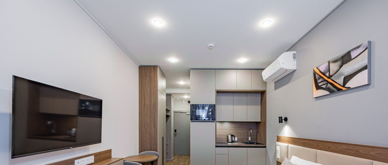 Ремонт в современном стиле, новая мебель и техника, есть кондиционер, посудомоечная машина, smart TV. Есть зонирование между спальной и кухонной зонами. В стоимость включены две поддерживающие уборки с заменой постельного белья и полотенец в месяц.