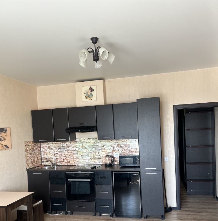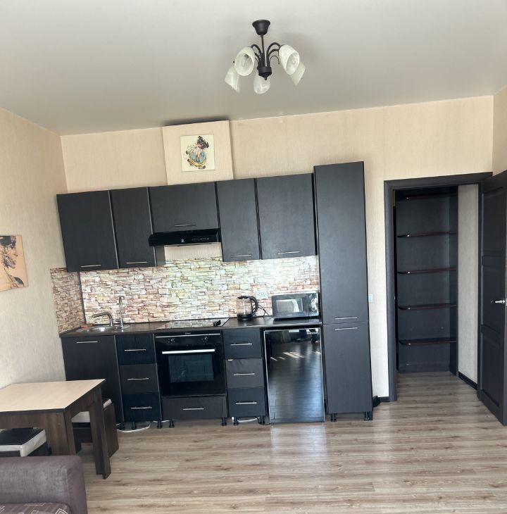 В студии произведен современный ремонт. Есть вся необходимая для комфортной жизни, мебель: 2-х спальный, угловой диван и односпальное кресло, кухонный гарнитур, микроволновка, 2 холодильника, в прихожей вместительный шкаф-купе, в ванне стиральная машина, микроволновка, интернет Ростелеком.