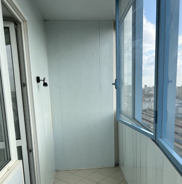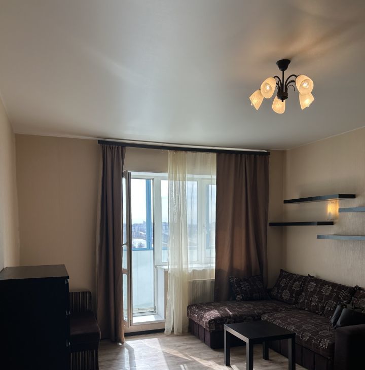 Современная студия с просторной застекленной лоджией, с панорамным видом на весь город, сторона света - восток. Солнце в утреннее время, до 12 часов дня.