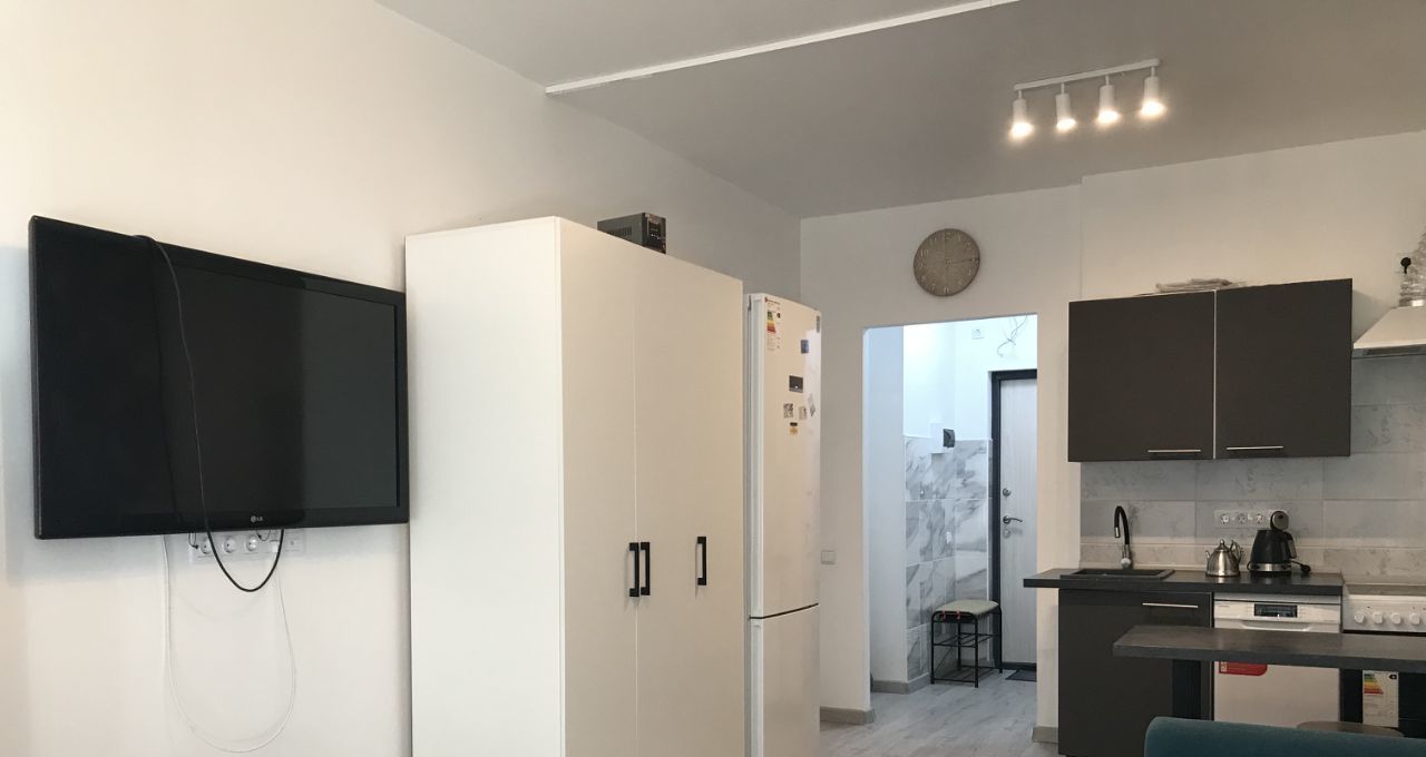 Светлая уютная студия в новом квартале. Есть все необходимое для жизни. В том числе рабочее место