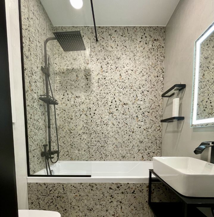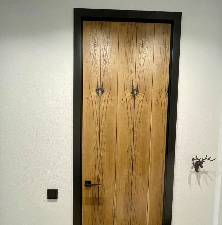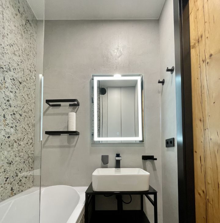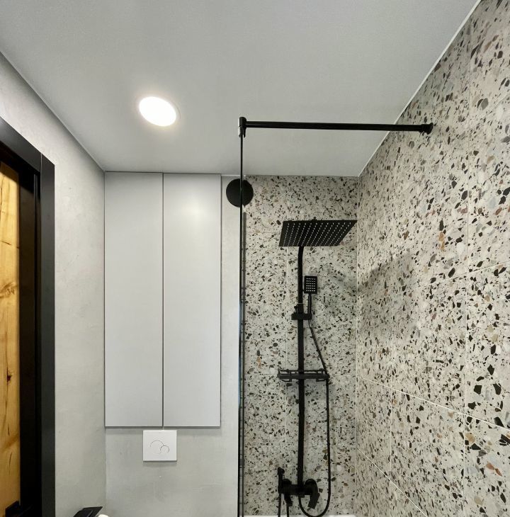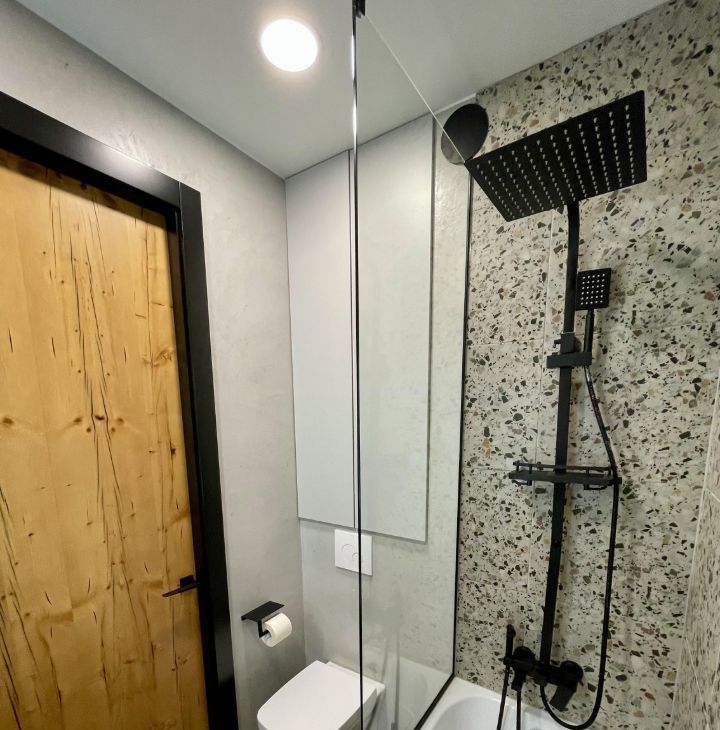 Совмещенный санузел 2,92 м2 с полноценной ванной и дизайнерской дверью высотой 2300 мм из эксклюзивного шпона.