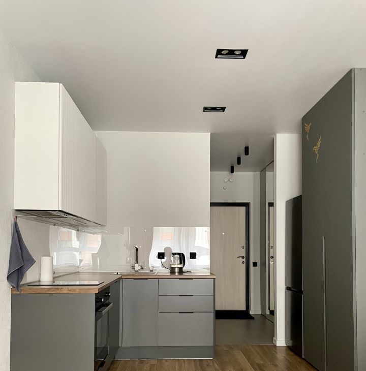 Комната 20,28 м2 поделена на зону отдыха и кухни.
