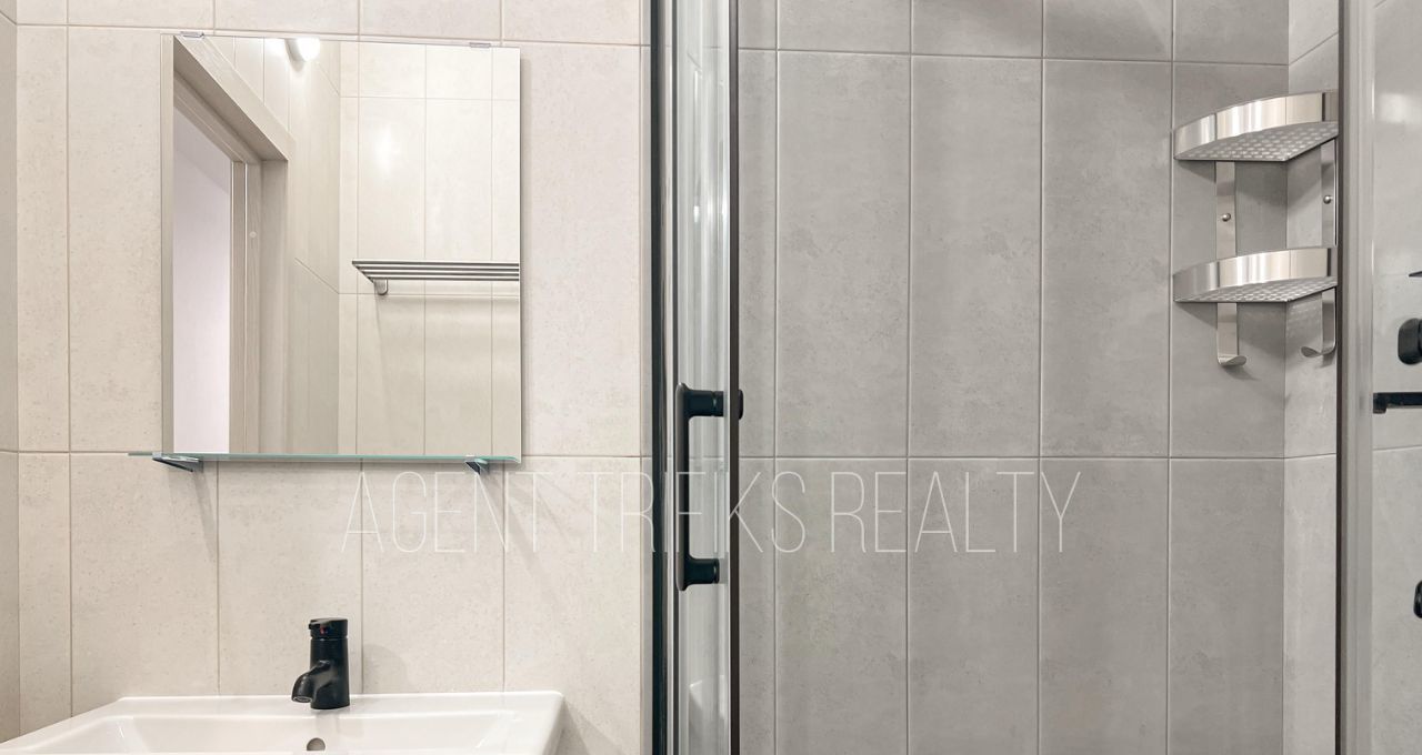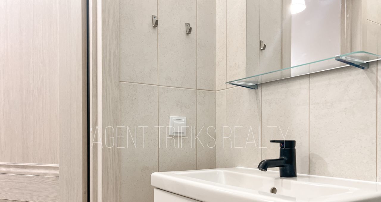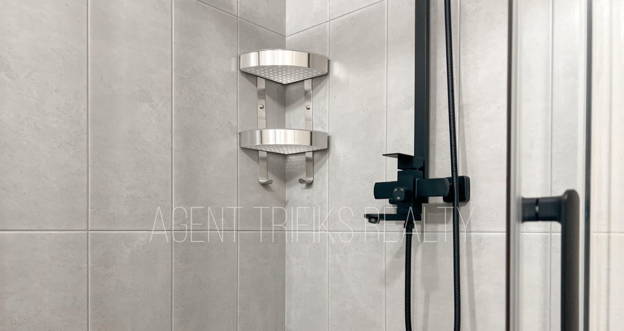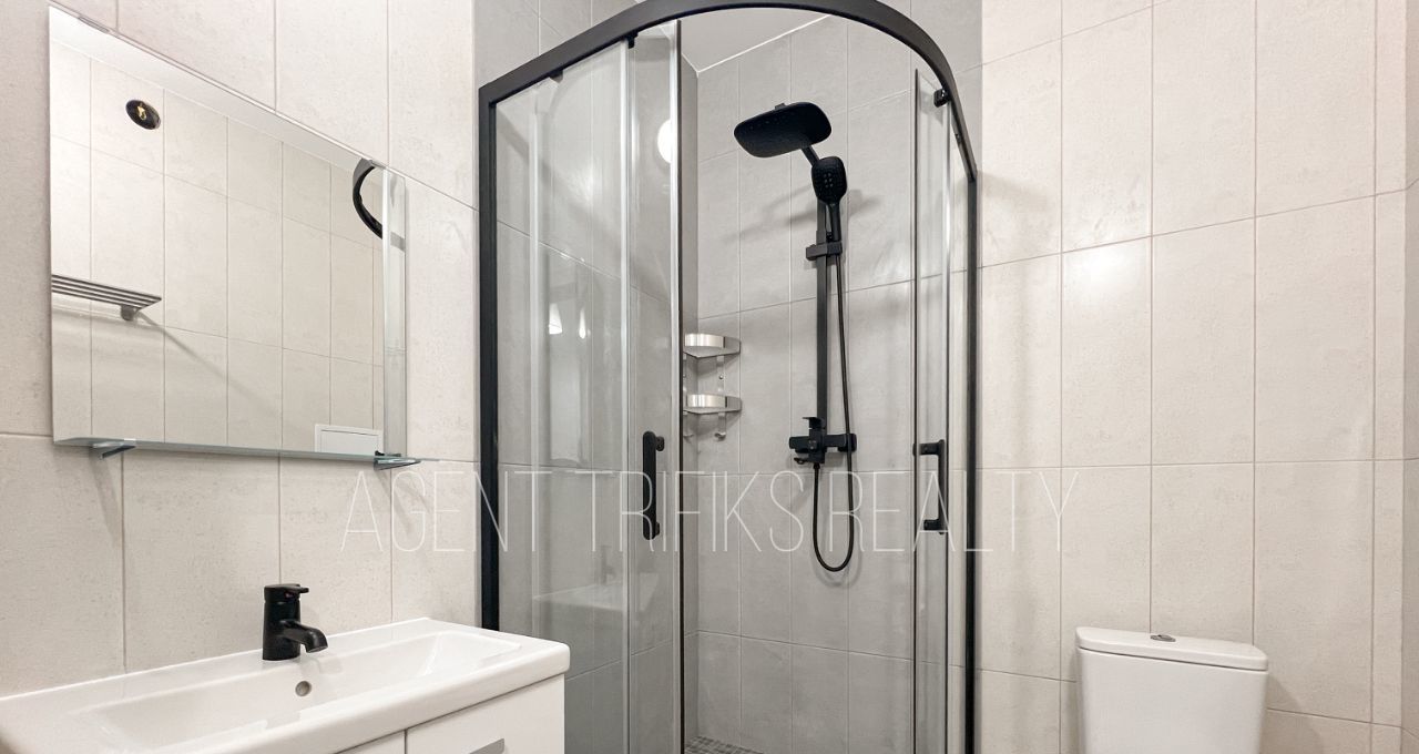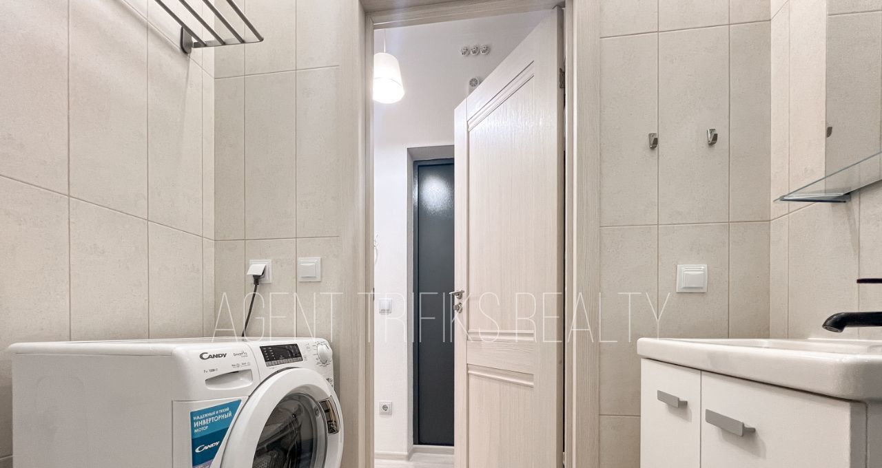 • Санузел: Совмещенный, с качественной отделкой. Установлена душевая кабина с тропическим душем и стильная черная сантехника. Есть стиральная машина Candy.