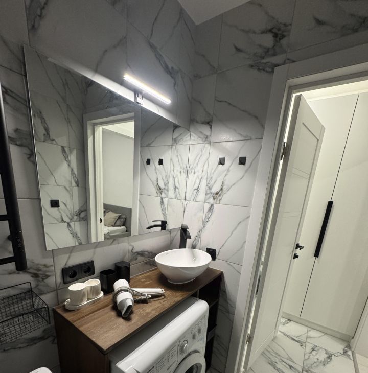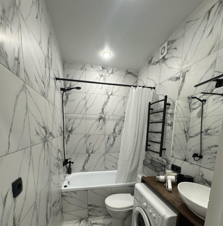 В квартире выполнен евроремонт, поэтому здесь уже есть все для вашего комфорта: на кухне и в комнате установлена мебель, а для бытовых нужд предусмотрена техника — холодильник, телевизор и стиральная машина. Ванная комната оборудована современной ванной. Комфортное расположение мебели и техника создают уют и удобство в повседневной жизни.