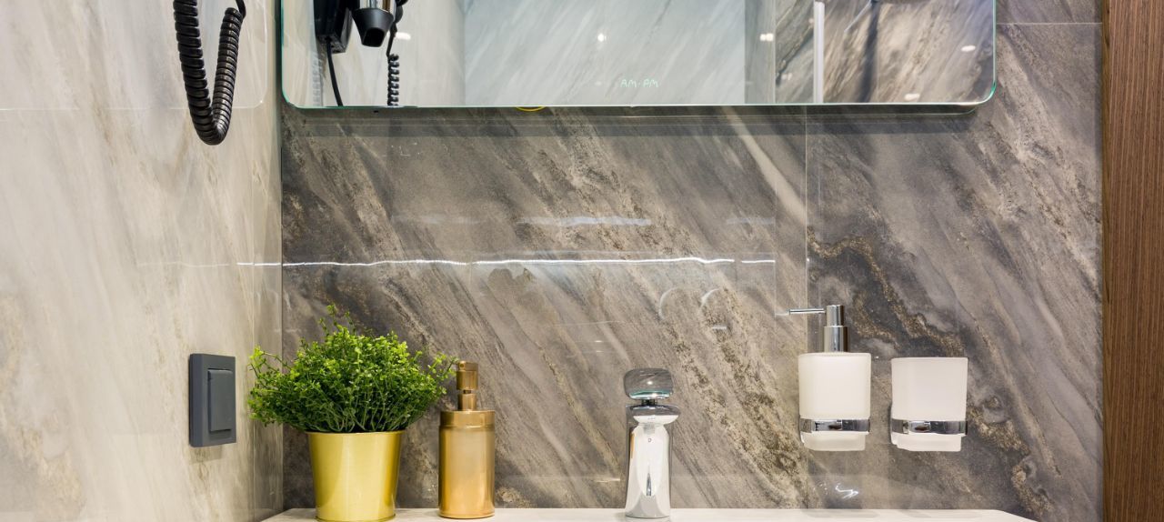 В ванной комнате мощный фен, полотенца, шампунь, гель для душа, жидкое мыло, полотенцесушитель и тумба для мелочей с зеркалом с подсветкой.