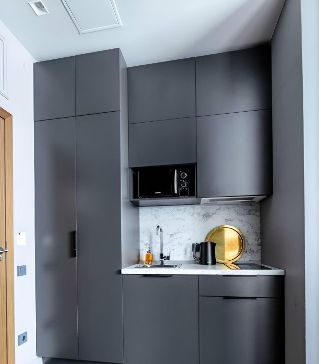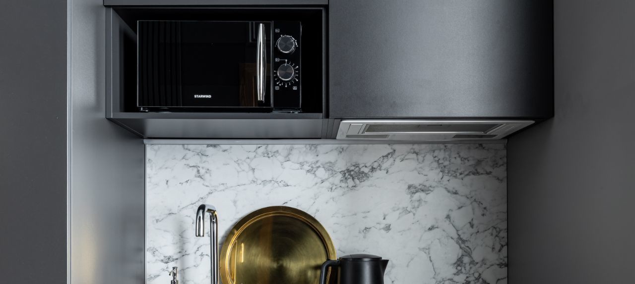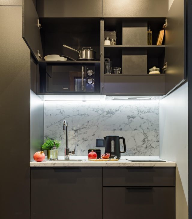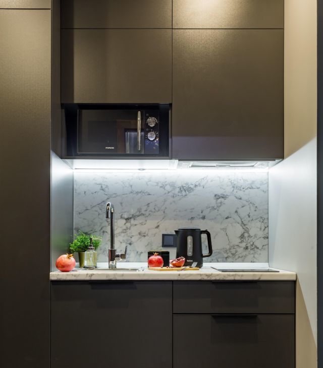 В кухонной зоне холодильник, электрический чайник, варочная панель, СВЧ-печь, полный набор посуды, чай и сахар, соль, масло, специи, фильтр для воды и сладкие комплименты.