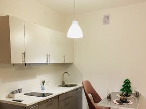 В квартире сделан дизайнерский ремонт, что создаёт уютную и современную атмосферу. Пространство студии грамотно зонировано — есть зона для отдыха и кухня с необходимой мебелью. Из техники предоставляется холодильник, стиральная машина и микроволновка. Ванная комната оборудована душевой кабиной, а окна выходят во двор, что обеспечивает тишину и спокойствие.