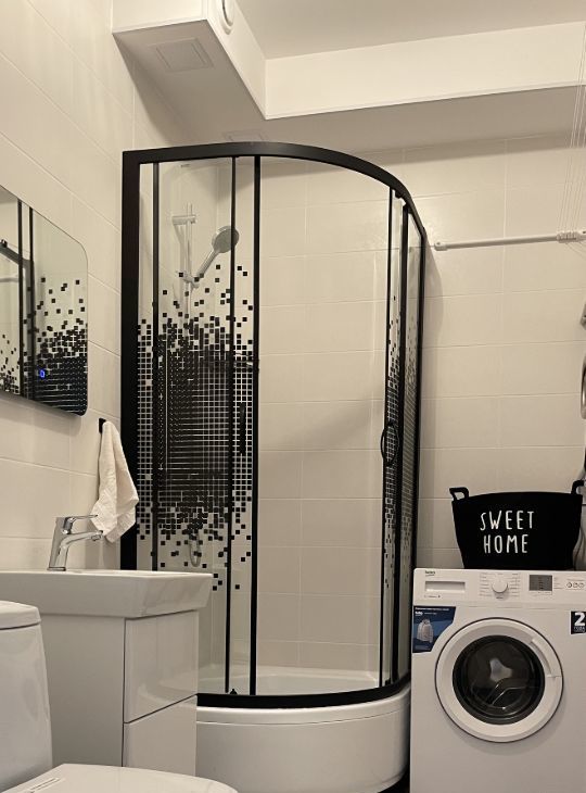 ВАННА: Душевая кабина, стиральная машина с корзиной для хранения грязного белья. Зеркало с подсветкой. Туба под раковиной для удобного хранения. Сушилка для белья, гладильная доска