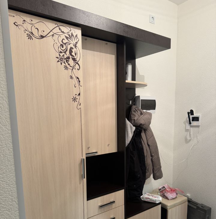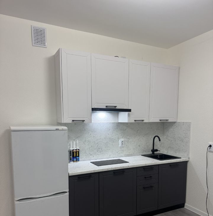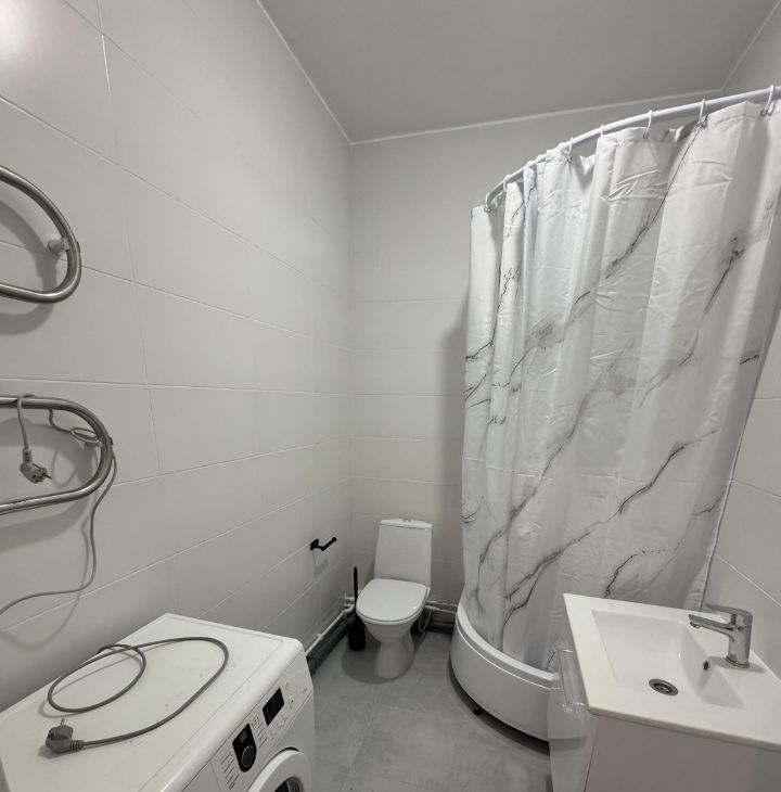 Квартира оснащена всем необходимым для комфортной жизни: на кухне и в комнате есть мебель, а также бытовая техника, включая холодильник и стиральную машину.