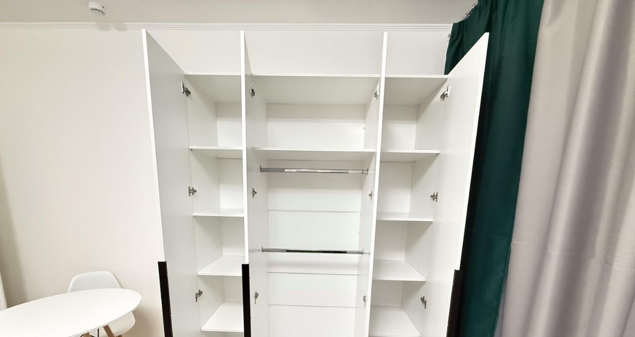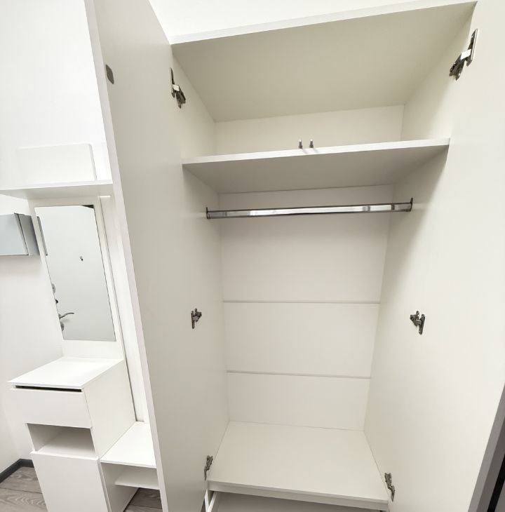 Комната оборудована просторным шкафом и удобным диваном, а также обеденной зоной.