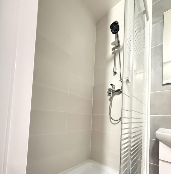 Санузел совмещенный, выполнен в светлых тонах и оснащен душевой кабиной.