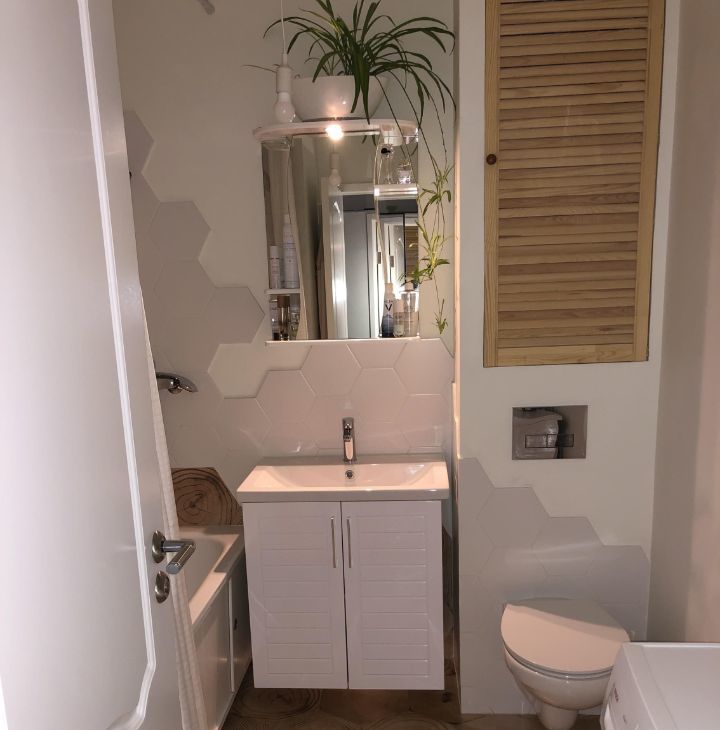 - В уборной: подвесной безободковый унитаз с инсталляцией, много места хранения под ванной, в шкафу-коробе. Никаких ужасных душевых кабин;